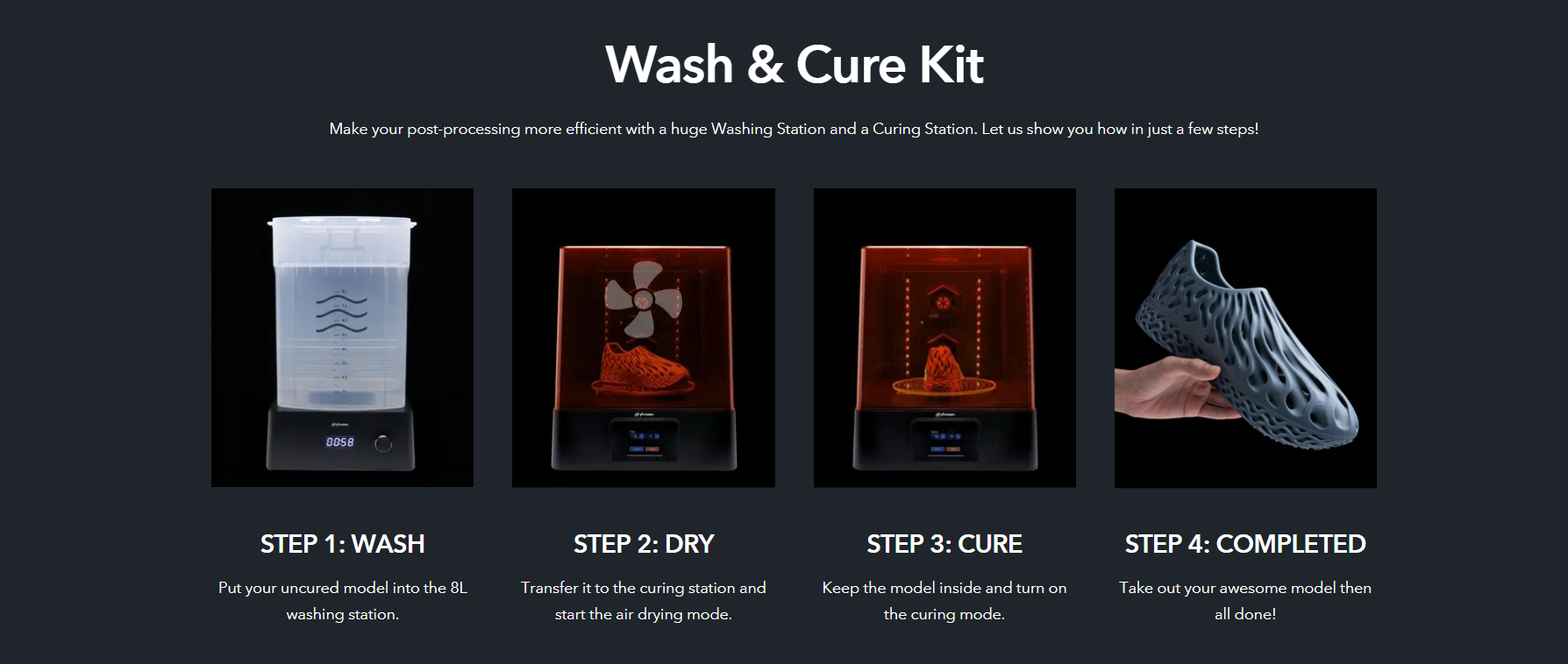 دستگاههای واش اند کیور، برای تکمیل مدلهای چاپشده با رزین نیز بسیار کارآمد هستند. همچنین دردسرهای پخت و شستوشو برای کاربران را از بین میبرند. دستگاه شست و شو و پخت WASH & CURE KIT، با کارایی بسیار بالا و بدون هیچ نقصی، این دو مرحله را برایتان انجام میدهد.