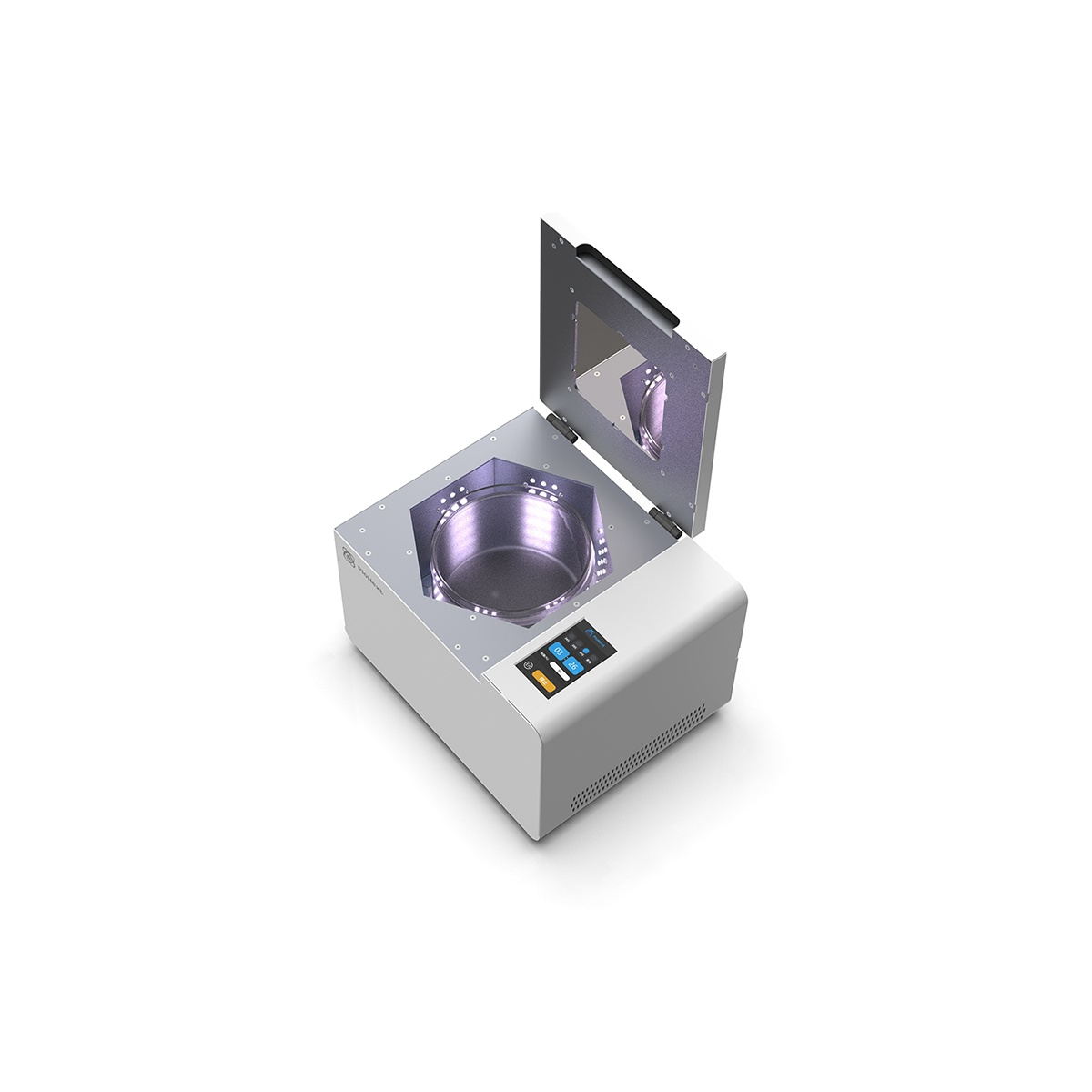 دستگاه UV-02 با طراحی پیشرفته و منحصربهفرد خود، فرایند پخت قطعات را از تمام جهات تضمین میکند. نورهای UV در شش وجه محفظه قرار گرفتهاند تا نور به طور یکنواخت به تمامی سطوح قطعات برسد. علاوه بر این، سطوح آینهای تعبیهشده در قسمت بالا و پایین محفظه، نور UV را بازتاب میدهند و این امر باعث توزیع مؤثرتر نور و تسریع فرایند پخت میشود. نتیجه این طراحی، پخت یکدست و باکیفیت است که از ایجاد نقص یا تاببرداری (Warping) در قطعات جلوگیری میکند.