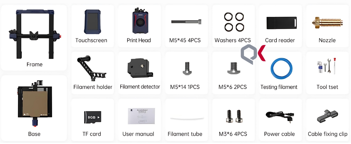 مونتاژ Kobra 2 در دفترچه راهنما ضمیمه شده و همچنین راهنمای شروع سریع آن، بهاندازه کافی جامع و کامل میباشد. اولین مرحله، شامل اتصال مجموعه عمودی (Y) با استفاده از چهار پیچ ارائه شده است. در مرحله بعد، اکسترودر را به صفحه پشتی دروازهای X متصل میکنید و آن را با چهار پیچ ارائه شده محکم خواهید کرد. پس از آن، میتوانید براکت صفحهنمایش لمسی را به همراه خود صفحه لمسی وصل کنید و از اتصال صحیح کابلها مطمئن شوید.