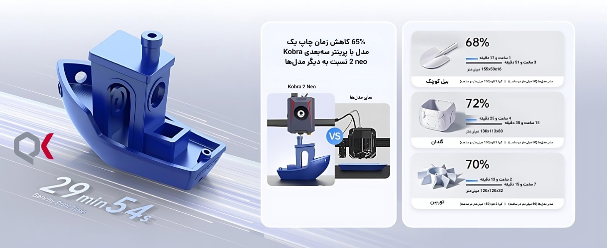 پرینتر سهبعدی Kobra 2 Neo دارای سرعت چاپ بالایی است و ترکیبی از دقت و عملکرد را ارائه میدهد و به شما این امکان را میدهد که ایدههای خود را با سرعت بینظیری خلق کنید. پرینتر سهبعدی Kobra 2 Neo با 5 برابر ارتقا نسبت به ورژن قبلی خود (Kobra Neo)، دارای حداکثر سرعت چاپ یعنی 250 میلیمتر بر ثانیه میباشد. ولی سرعت توصیهشده برای انجام کار، 150 میلیمتر بر ثانیه است که از طریق آن میتوانید با دقت بالایی آنچه که میخواهید را چاپ کنید.