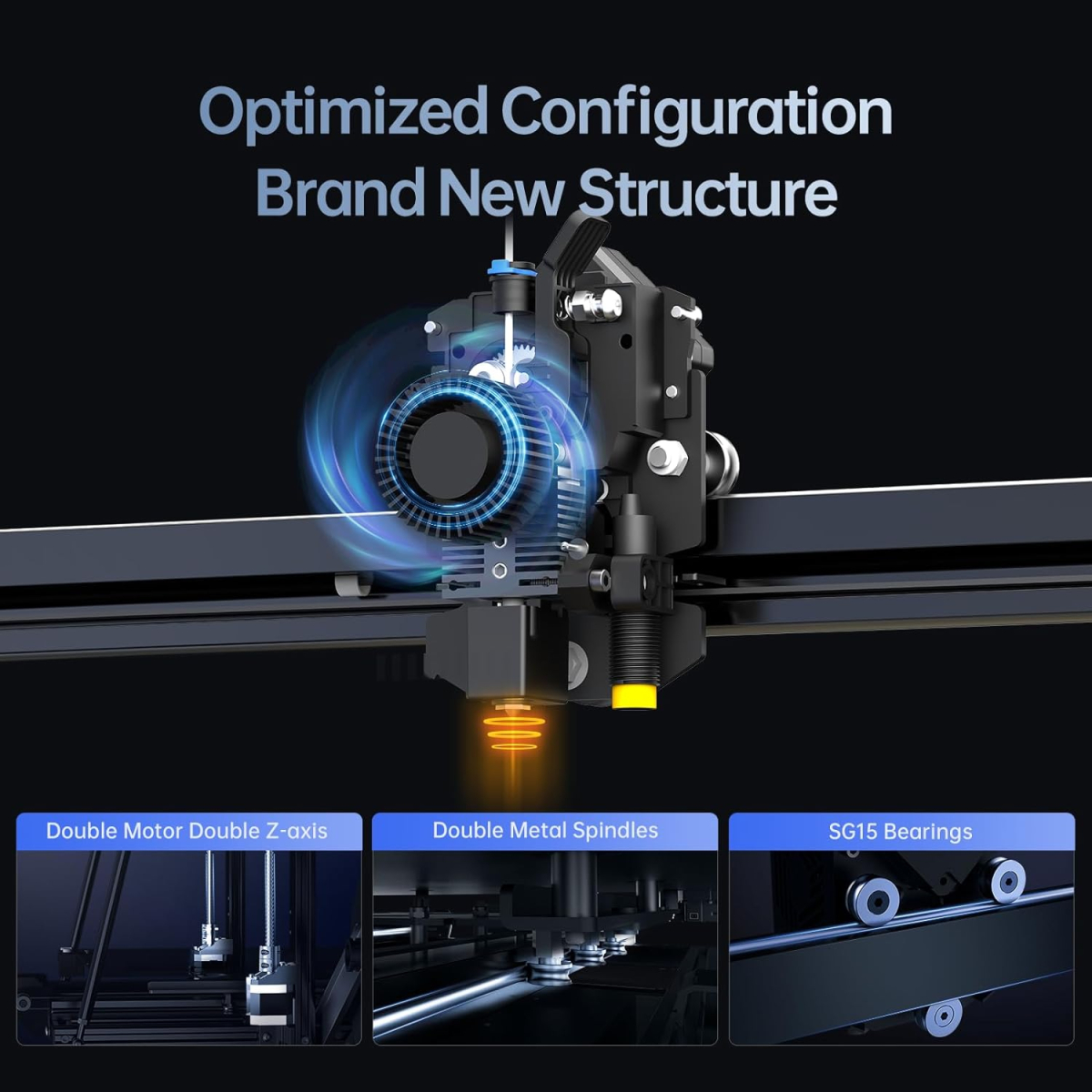 یکی از مهم ترین اجزای پرینتر 3 بعدی، اکسترودر آن است. اکسترودر، با قسمت Hot End پرینتر سه بعدی ارتباط دارد. Hot End قسمتی از پرینتر است که فیلامنت را ذوب میکند. با استفاده از اکسترودر مستقیم و ساختار حرکتی دو محوره دو موتوره پرینتر سه بعدی kobra 2 max که برای سیستمهای اکستروژن و خنککننده کاملا بهینهسازی شدهاند، مواد را به طور موثر و دقیق تحویل میدهد و امکان ذوب و خنکسازی سریع را فراهم میکند. این عملکرد منجر به غیر قابل مشاهده بودن خطوط لایه میشود. ساختار پایدار Kobra 2 Max با دو موتور، محور Z همگام شده و محور Y دوگانه که بر روی بلبرینگهای SG15 هدایت میشود، بهترین شرایط ممکن را برای اکسترودر آن تضمین میکند. ترکیبی از عناصر سختافزاری قوی و در عین حال ظریف، اکستروژن کارآمد و دقیق مواد را با خنککنندگی بسیار موثر در همان زمان تضمین میکند.