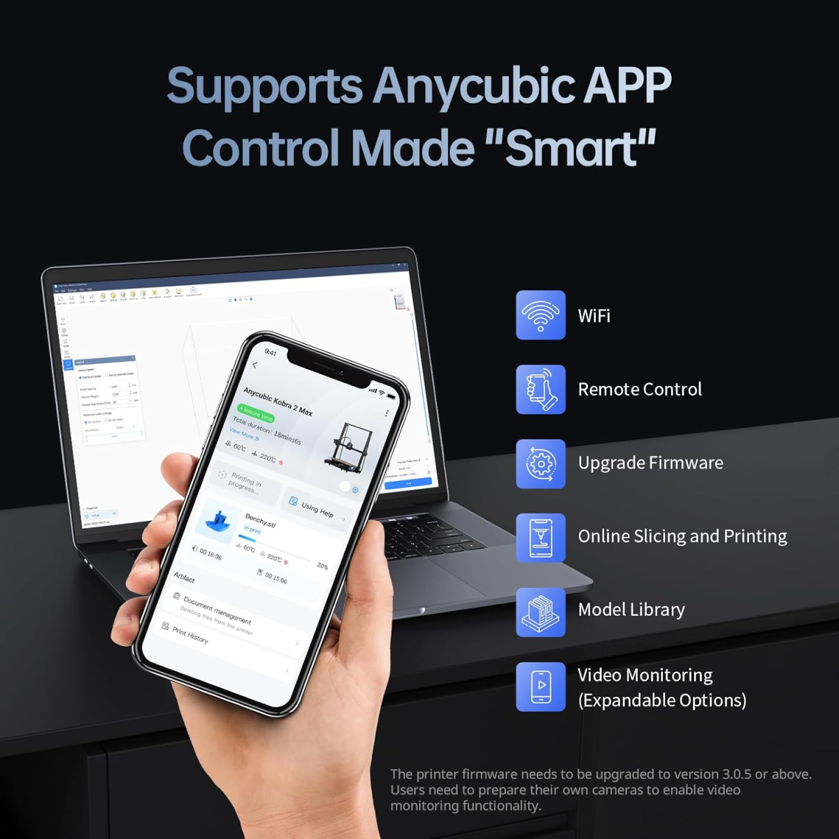 با برنامه جدید Anycubic میتوانید پرینتر خود را در هر زمان از راه دور کنترل کنید که این مسئله از طریق WiFi امکان پذیر میباشد. همچنین بهروزرسانیهای میانافزار را از طریق کارت SD یا کابل را کاملا فراموش کنید. برنامه جدید Anycubic بهروزرسانی را در کمترین زمان برای شما انجام میدهد. برش و چاپ آنلاین، نظارت ویدیویی و عکاسی با گذشت زمان، کنترل از راه دور و مدیریت و... دیگر کارهایی است که این نرم افزار قادر به انجام دادن آنهاست.