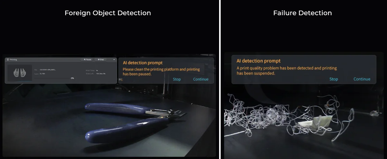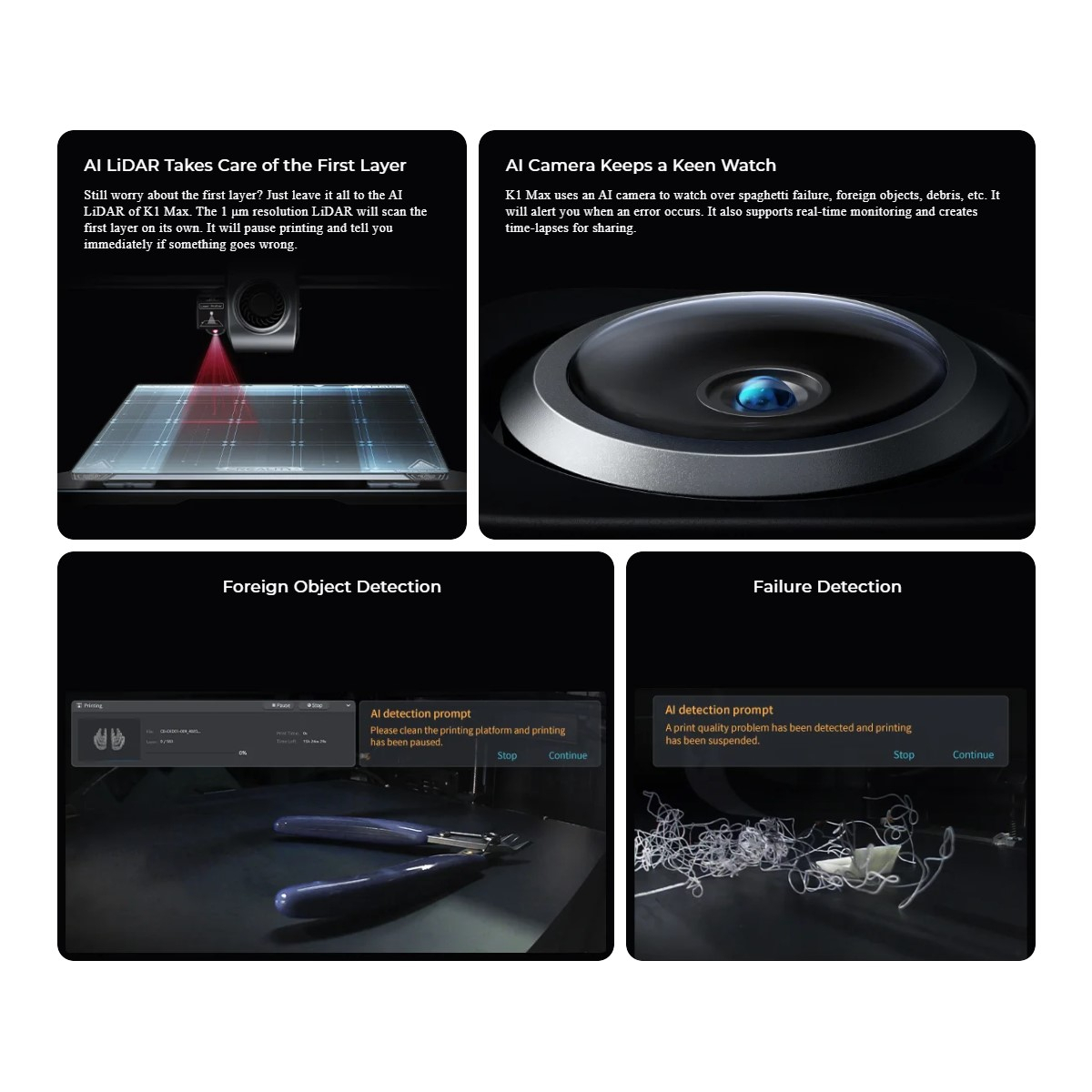 پرینتر K1 MAX AI FAST با استفاده از هوش مصنوعی برای بهینهسازی فرآیند چاپ و کاهش خطا استفاده میکند. این امر منجر به چاپهای باکیفیتتر و قابل اعتمادتر و کاهش خطا درچاپ میشود. Al Camera به طور مداوم آنچه را که در داخل چاپگر اتفاق می افتد مشاهده می کند. برای مثال رشته های نازک فیلامنت که از نازل بیرون می زند و گره می خورد و چاپ را خراب می کند. یاهرگونه ماده ناخواسته (مانند گرد و غبار یا تکه های سرگردان رشته) است که می تواند در ناحیه چاپ نفوذ کند و مشکلاتی ایجاد کند.