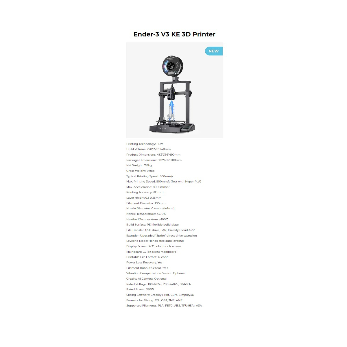 ویژگی های پرینتر سه بعدی Ender-3 V3 KE