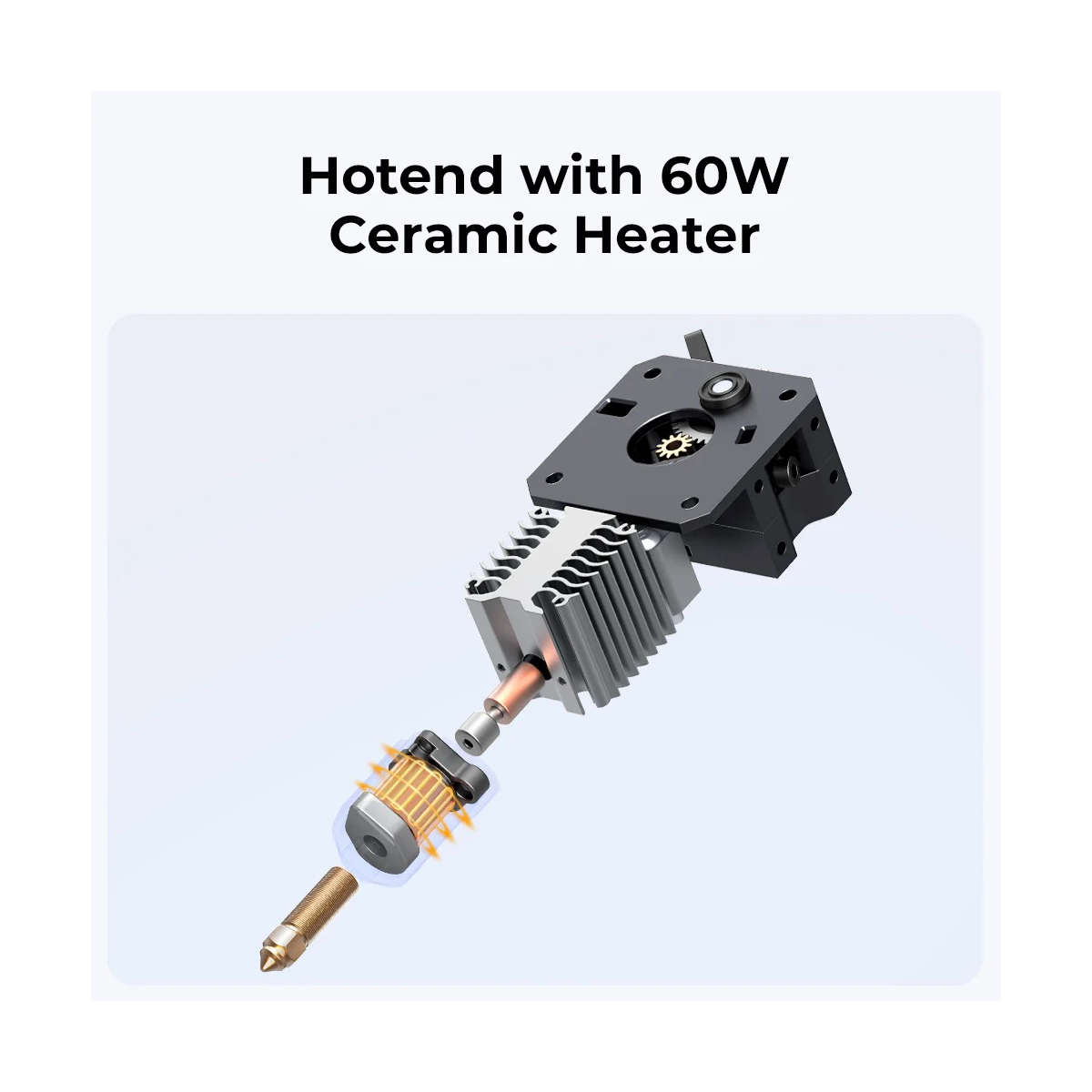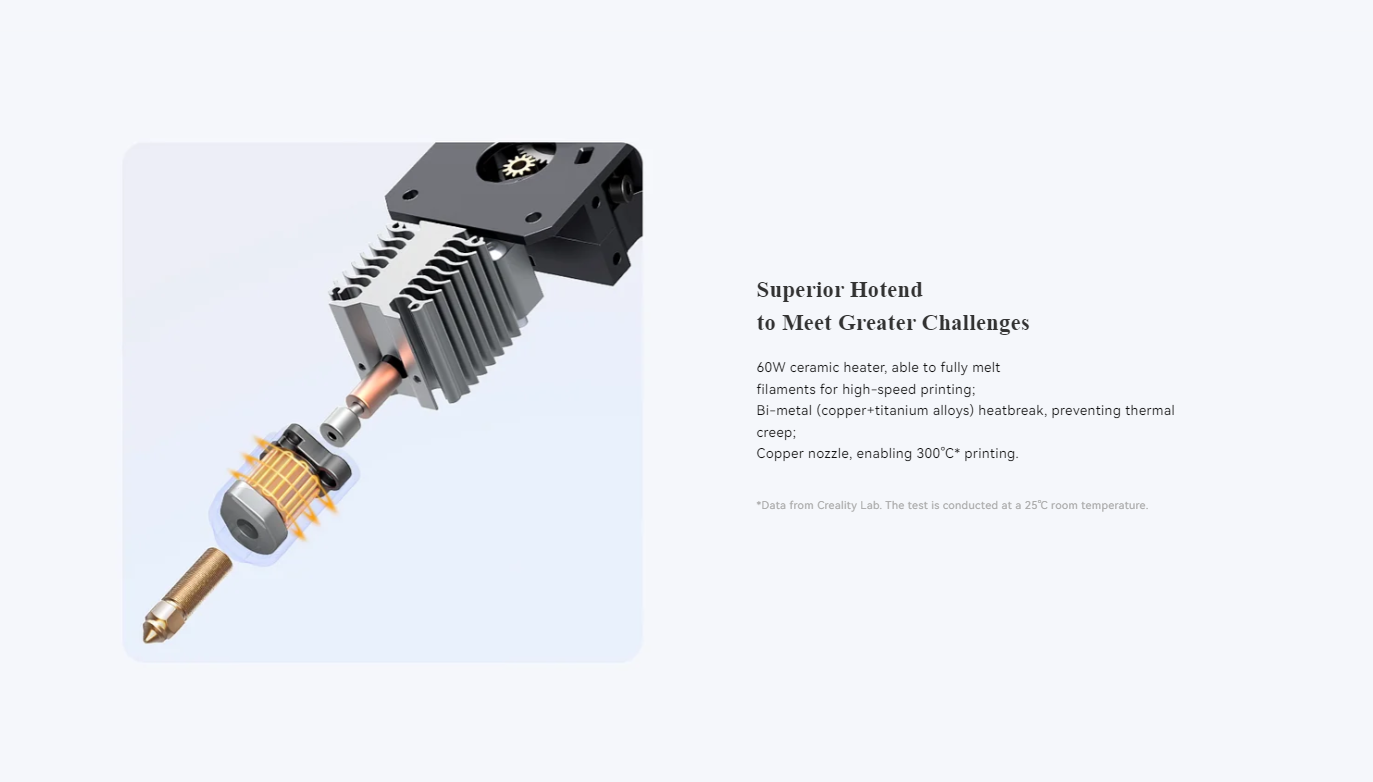 هاتاند Ender-3 V3 KE ویژگیهای منحصر به فردی دارد که باعث میشود عملکرد بهتری در چاپ سهبعدی داشته باشید. این هاتاند مجهز به یک هیتر سرامیکی 60 واتی است که با قدرت بالا قادر به ذوب کامل فیلامنتها است. نازل مسی این هاتاند قادر به تحمل دماهای بالا تا 300 درجه سانتیگراد است. این ویژگی باعث میشود تا با انواع مختلفی از فیلامنتها که نیاز به دماهای بالاتر دارند، کار کنید. بهعنوان مثال، فیلامنتهای خاص و مقاوم دربرابر حرارت که برای کاربردهای صنعتی استفاده میشوند، بهراحتی با این نازل قابل چاپ هستند.