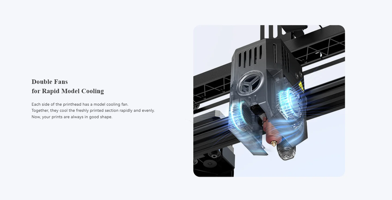 فنهای خنککننده در هر دو طرف هد چاپ نصب شدهاند تا بهصورت هماهنگ و مؤثر عمل کنند. هنگامی که لایه جدیدی از فیلامنت اکسترود میشود، این فنها بهسرعت وارد عمل شده و بخش تازه چاپ شده را بهطور یکنواخت خنک میکنند. این خنکسازی سریع و یکنواخت، به جلوگیری از مشکلاتی مانند انقباض، تغییر شکل و پیچیدگی قطعات کمک میکند. همچنین باعث افزایش استحکام و پایداری قطعات چاپ شده میشود؛ زیرا فیلامنت بهسرعت از حالت نیمه مایع به حالت جامد تبدیل میشود. به این ترتیب، باوجود فنهای خنککننده، میتوانید مطمئن باشید که چاپهای شما همیشه در بالاترین کیفیت ممکن خواهند بود.
