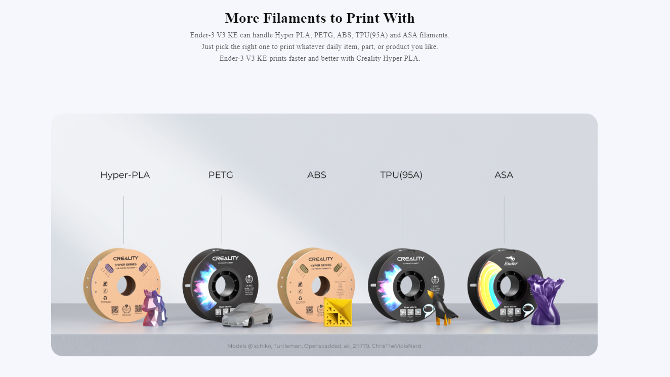 کمپانیCreality یکی از برندهای پیشرو در زمینه تولید پرینترهای سهبعدی است و بهدلیل ارائه محصولاتی با کیفیت بالا و قیمت مناسب، به شهرت جهانی رسیده است Ender-3 V3 KE .که از چاپگرهای 3D این برند است، بهدلیل عملکرد عالی و کاربری آسان، نظر بسیاری از کاربران را به خود جلب کرده است. این پرینتر سهبعدی با طیف گستردهای از فیلامنتها سازگار است که به همین دلیل مدلهای متنوعی با ویژگیهای مختلف را میتوانید چاپ کنید. همچنین با سنسورها و فناوری هوشمند، چاپ بدون ایرادی را ارائه میدهد.