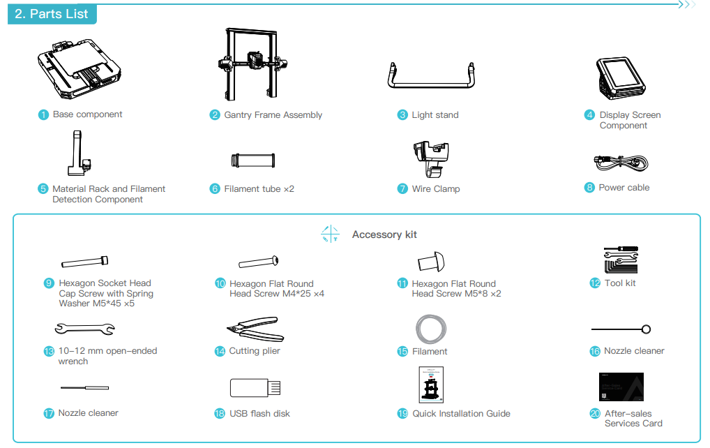 پاککننده نازل، نازل، دیسک فلش USB، ماژول گیره ثابتکننده FFC، محفظه مواد و ماژولهای تشخیص فیلامنت،