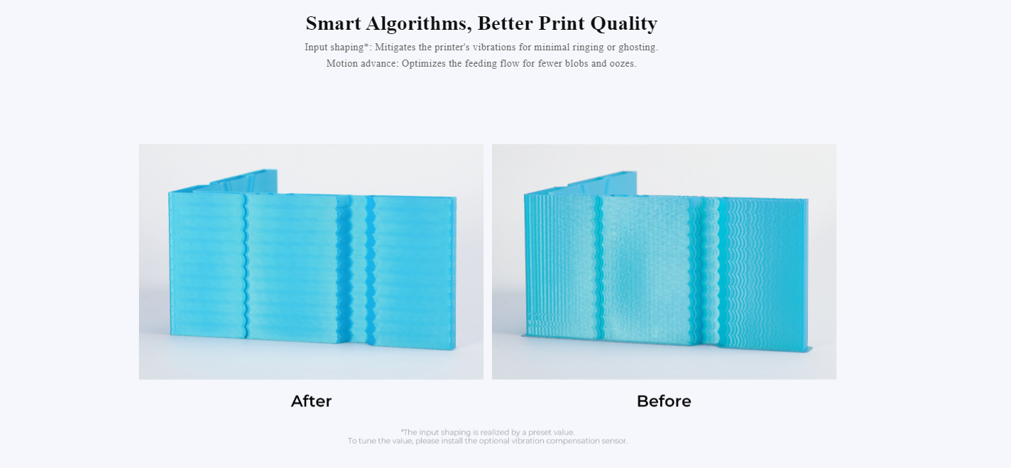 - شکلدهی ورودی (Input shaping): این فناوری لرزشهای پرینتر سهبعدی را بهحدأقل میرساند و از ایجاد خطوط و سایهها در چاپ جلوگیری میکند. با Input shaping، چاپهای شما صافتر، دقیقتر و عاری از هرگونه نقص ظاهری خواهند بود.