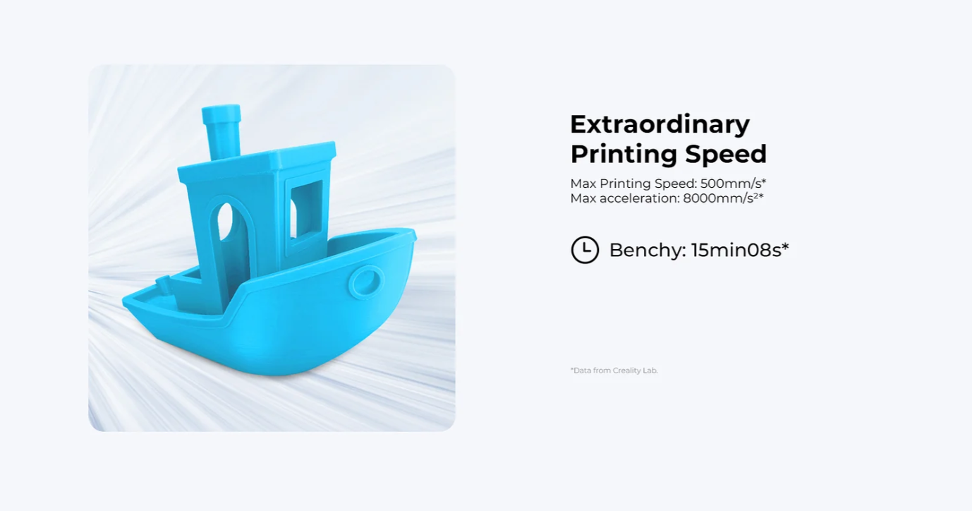 این پرینتر میتواند با سرعت 300 میلیمتر برثانیه چاپ کند که آن را به یکی از سریعترین پرینترهای سهبعدی در این رده قیمتی تبدیل میکند. سرعت چاپ بالای این دستگاه به شما کمک میکند که پروژههای خود را با کارایی و بهرهوری بیشتری به پایان برسانید. لازم به ذکر است که حدأکثر سرعت چاپ چاپگر سهبعدی Ender-3 V3 KE برابر با 500 میلیمتر در ثانیه (تست شده با Hyper PLA) میباشد.