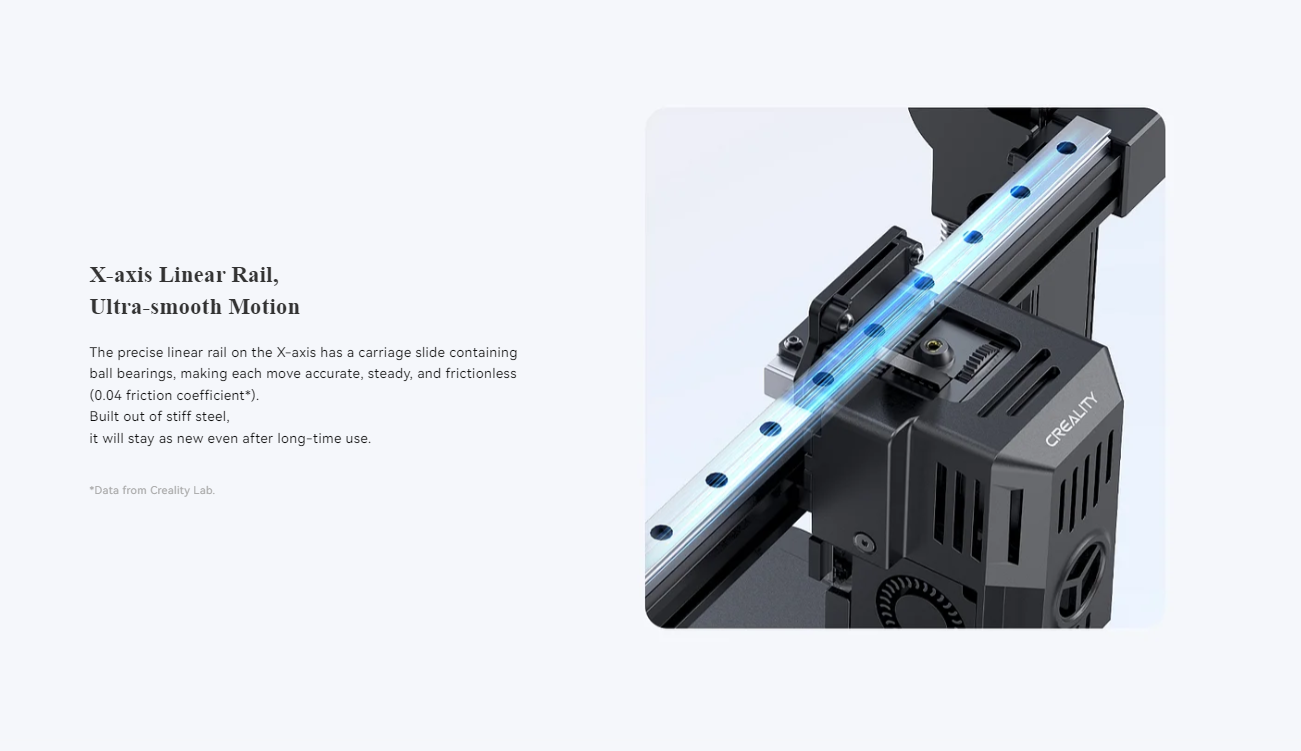این پرینتر سهبعدی به یک ریل خطی بسیار دقیق در محور X مجهز شده است که از حرکتی روان، بیصدا و بدون اصطکاک (ضریب اصطکاک 0.04) برای ایجاد چاپهای باکیفیت و دقیق اطمینان حاصل میکند. این ریل از فولاد ضدزنگ سخت ساخته شده که مقاومت و استحکام بالایی را دربرابر خم شدن و سایش در طول زمان ارائه میدهد. دقت بالای آن ایجاد چاپهای سهبعدی با جزئیات دقیق را تضمین میکند.