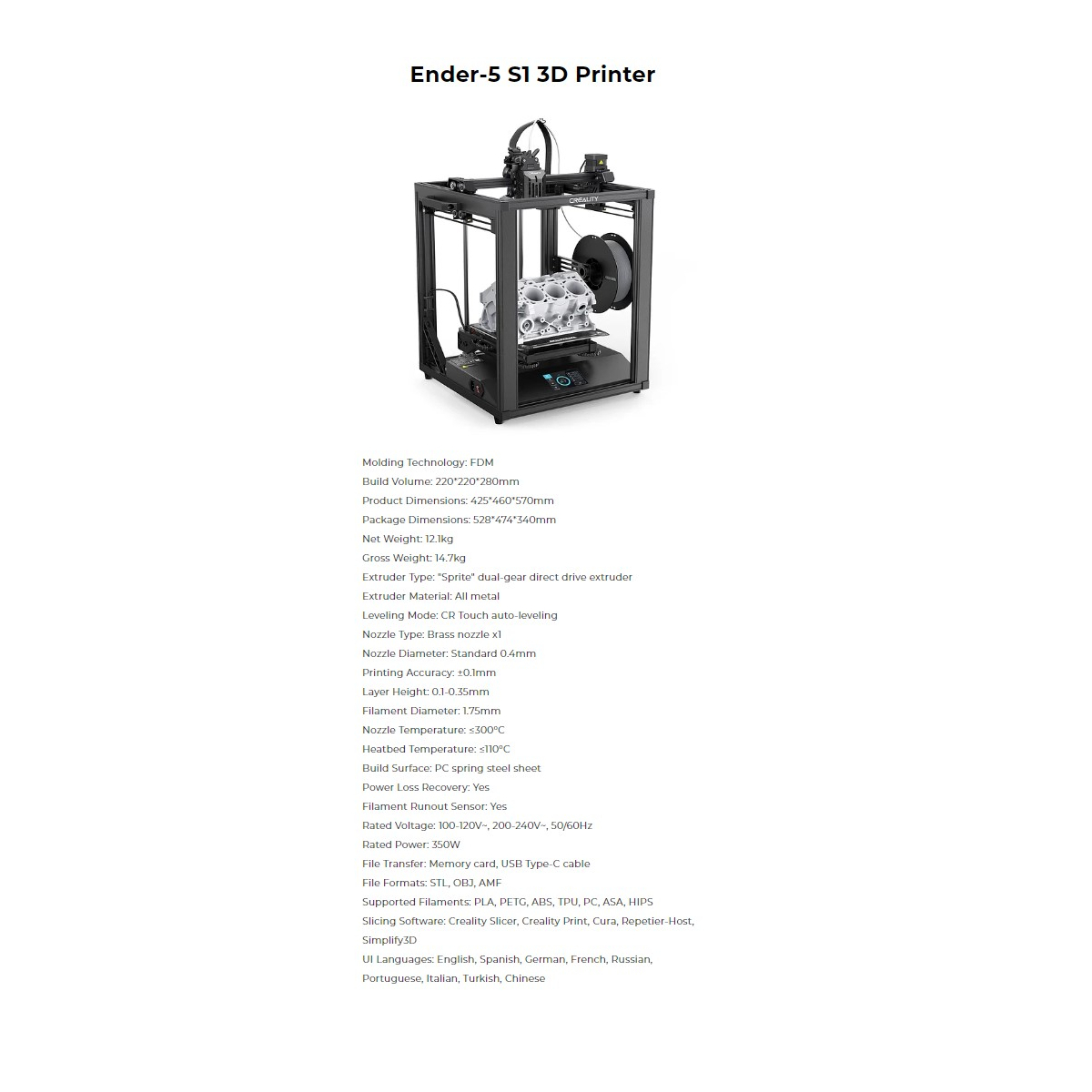 ویژگیهای پرینتر سه بعدی کریلیتی مدل ENDER-5 S1 برند CREALITY