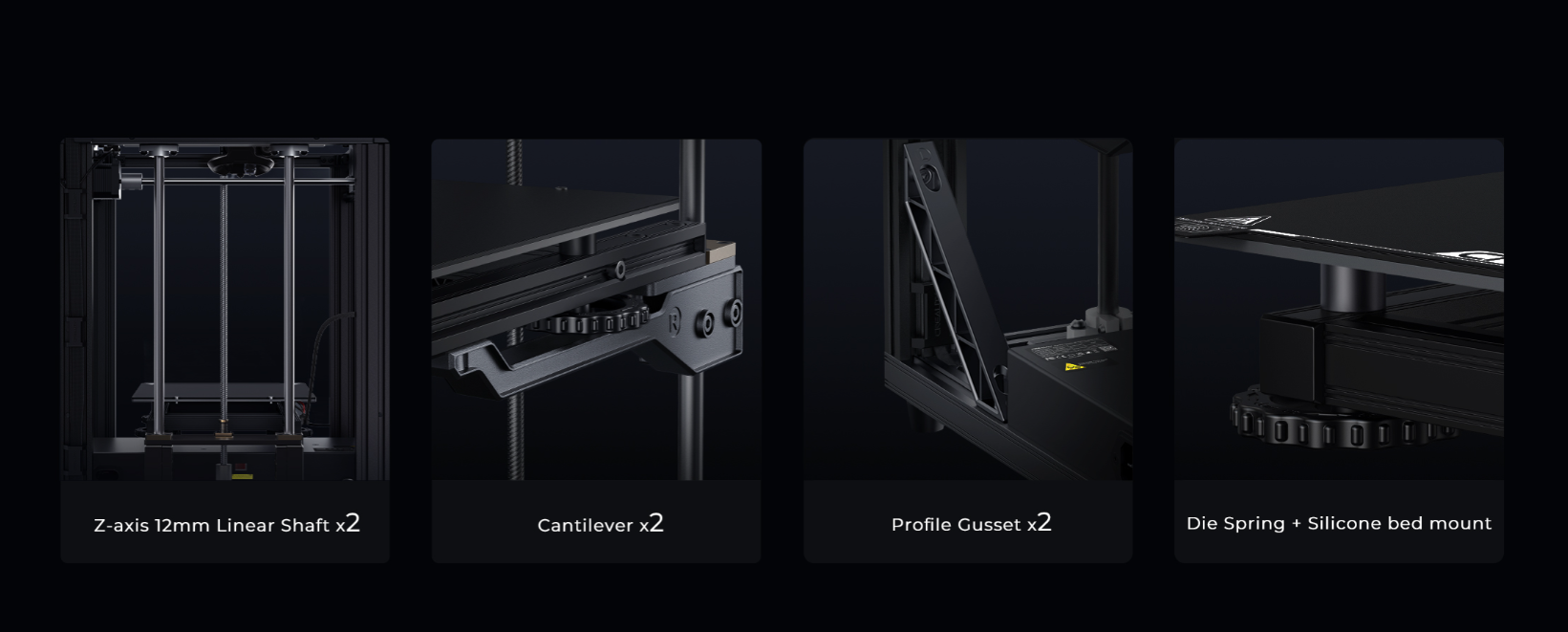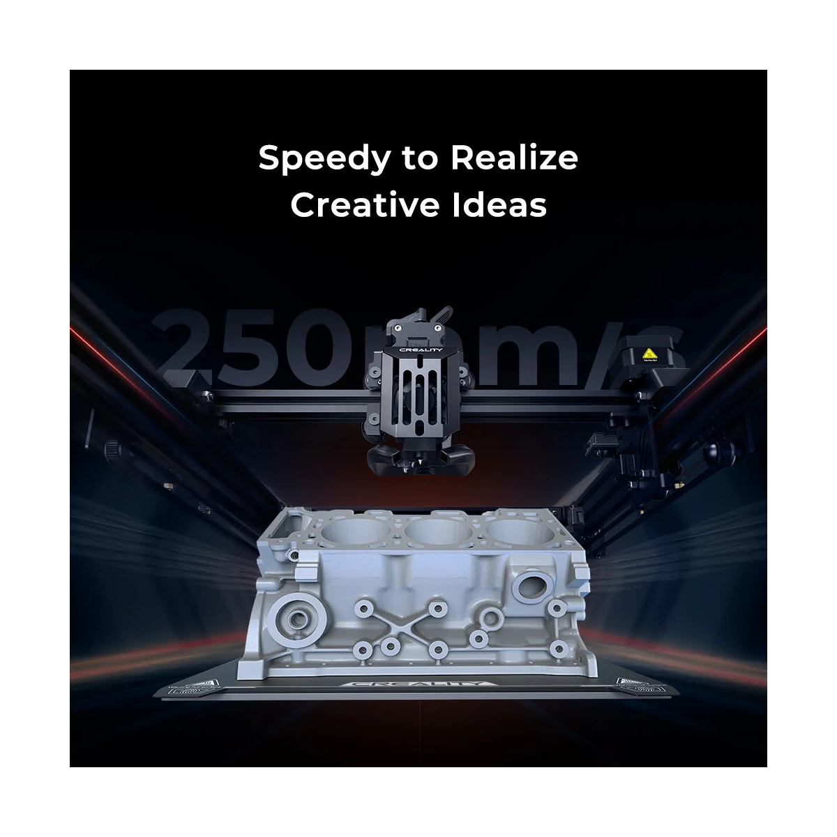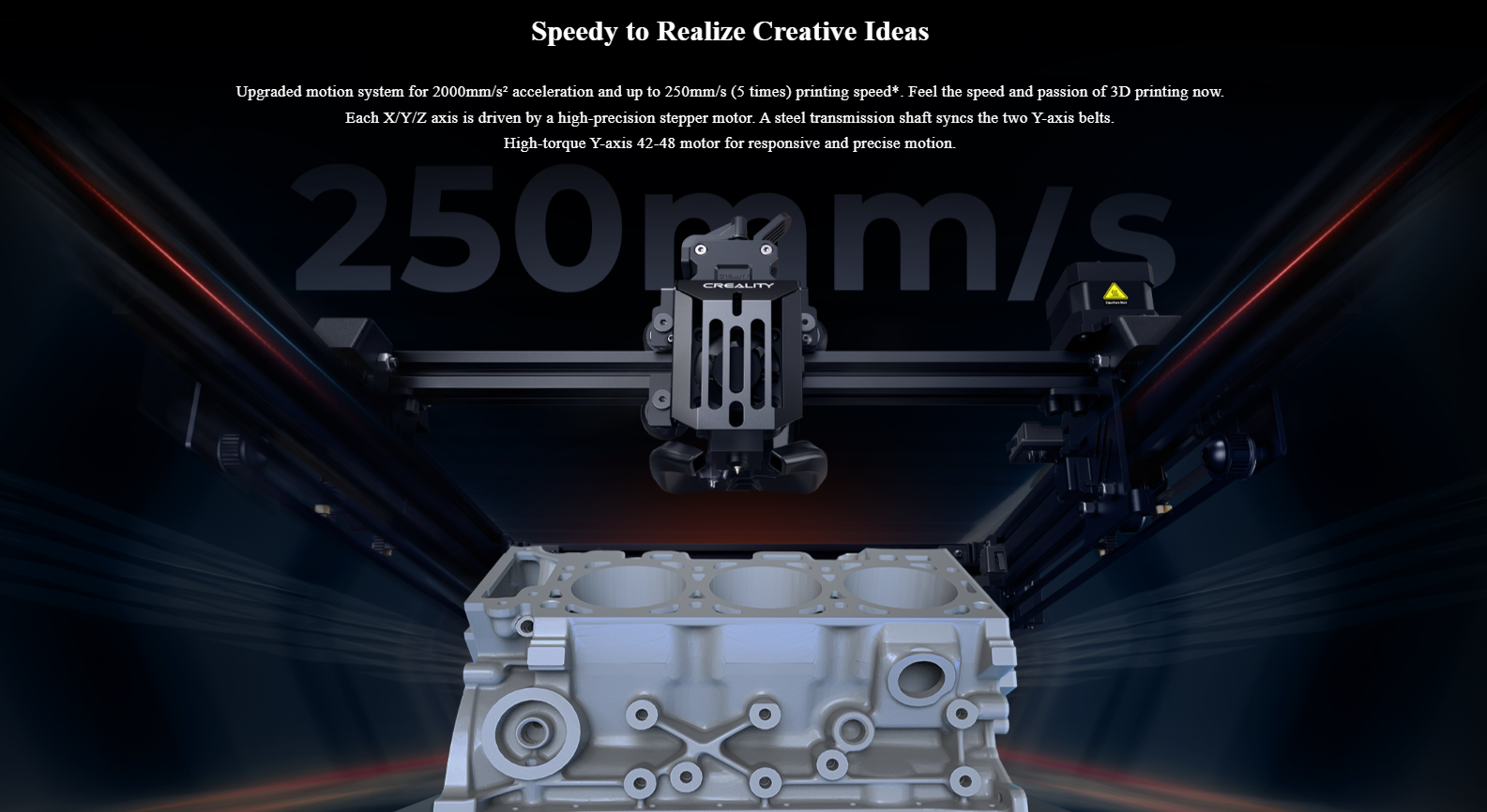 این پرینتر سه بعدی با بهرهمندی از سیستم حرکت ارتقاء یافته، شتابی خیرهکننده معادل 2000 میلیمتر بر ثانیه مربع و سرعتی فوقالعاده تا 250 میلیمتر بر ثانیه را ارائه میدهد که 5 برابر سریعتر از مدلهای پیشین است. این پرینتر سه بعدی از دقت و ظرافت بالایی نیز برخوردار است. هر محور X/Y/Z توسط یک موتور پلهای با دقت بالا هدایت میشود و یک محور انتقال فولادی، دو تسمه محور Y را به طور کامل همگامسازی میکند. موتور 42-48 محور Y با گشتاور بالا، حرکتی روان و دقیق را تضمین میکند و به شما اطمینان میدهد که چاپ نهایی با بالاترین کیفیت ارائه خواهد شد.