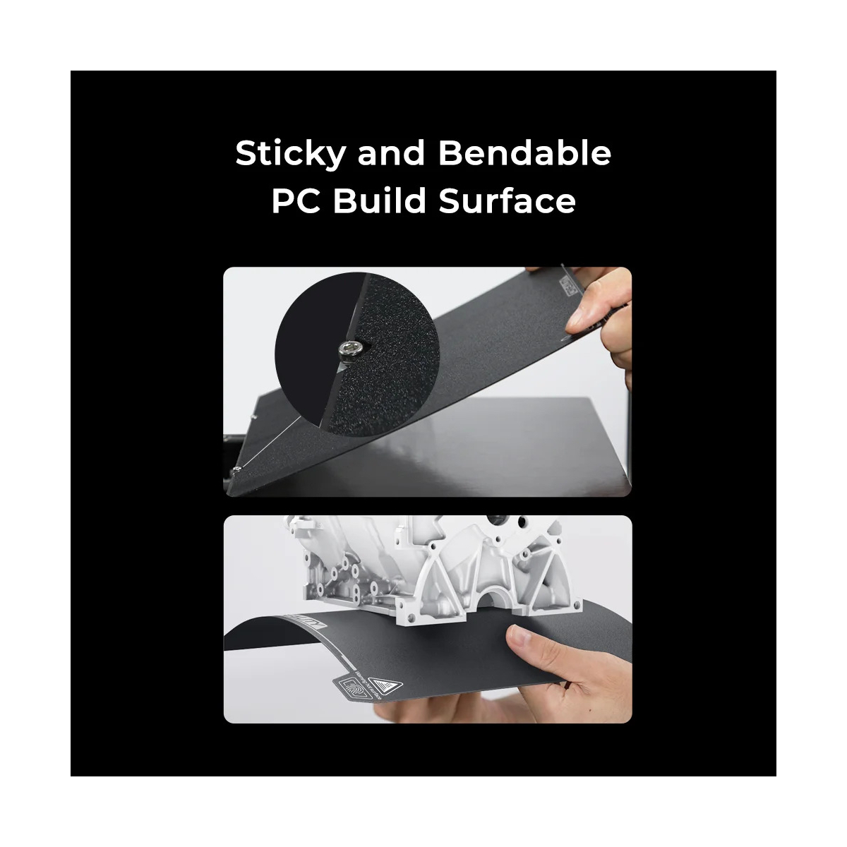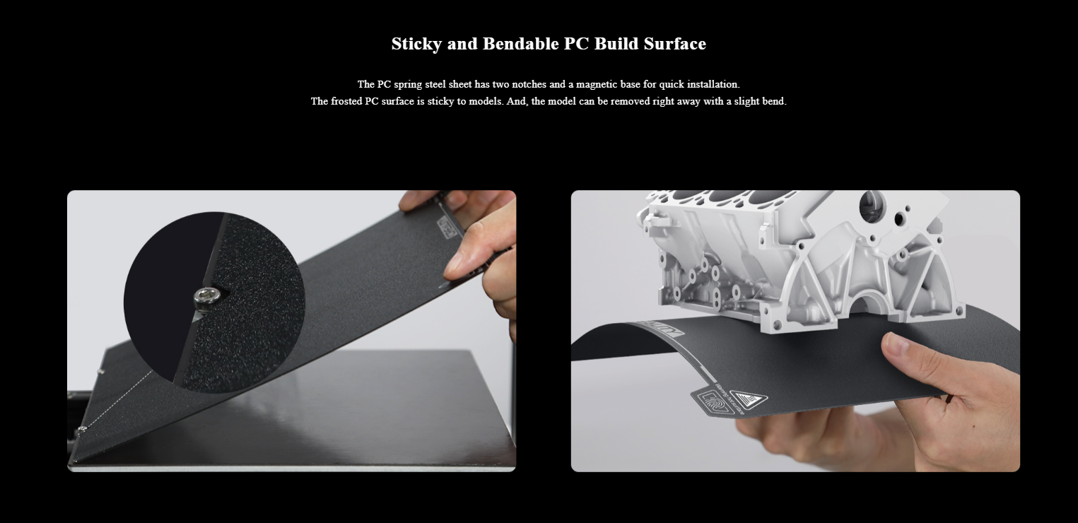 این پرینتر سه بعدی مجهز به سطح ساخت PC فنری با دو شیار و یک پایه مغناطیسی است که نصب آن را سریع و آسان میکند. سطح PC مات این صفحه ساخت، چسبندگی بالایی به مدلهای چاپ شده دارد و از جدا شدن آنها در حین چاپ جلوگیری میکند. پس از اتمام چاپ، میتوانید با خم کردن سطح PC به راحتی مدل چاپ شده را از آن جدا کنید.