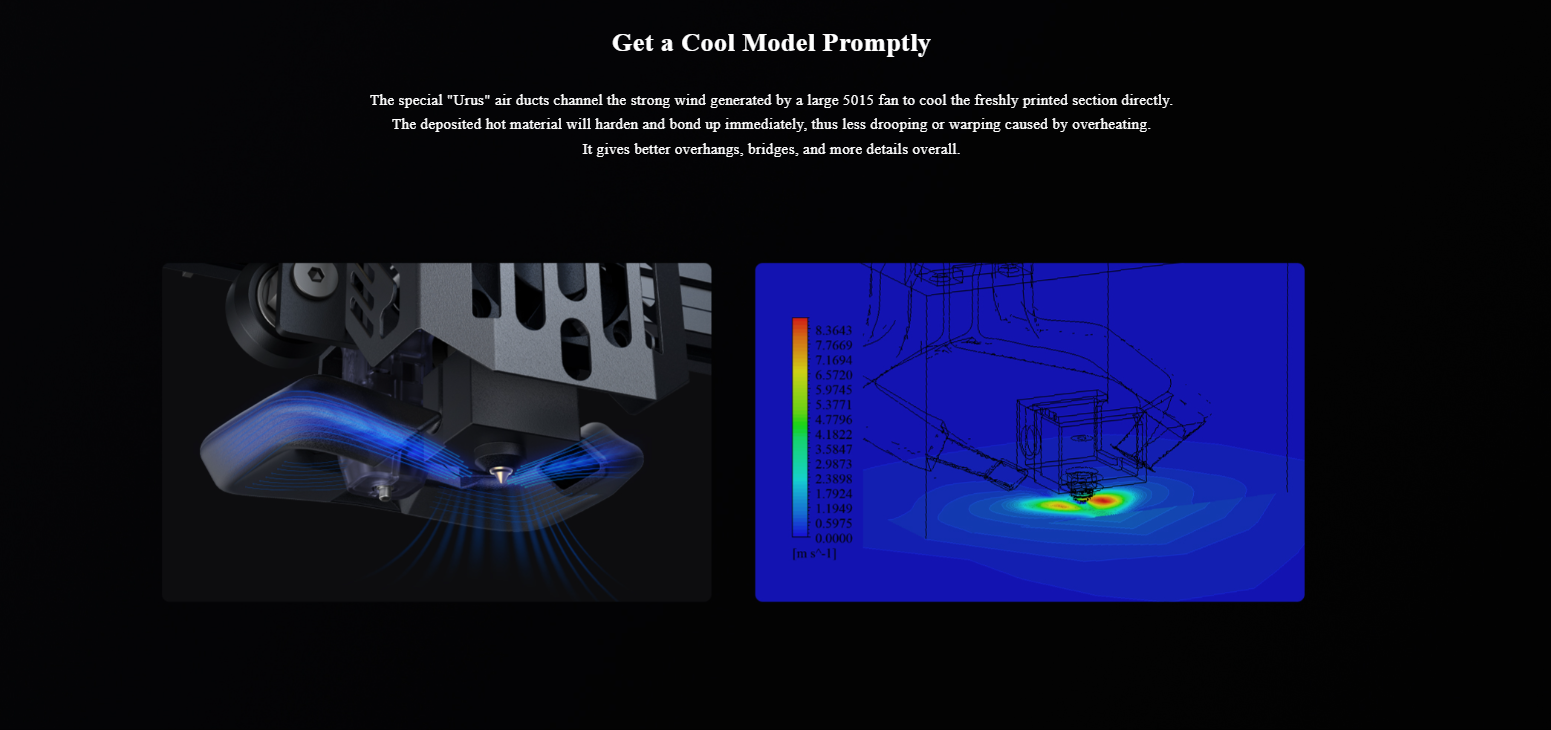 با استفاده از سیستم خنکسازی "Urus"، میتوانید مدلهای چاپ شده با کیفیت بالا را با جزئیات دقیق و بدون نقص چاپ کنید. این سیستم خنکسازی به ویژه برای چاپ با فیلامنتهای ABS و PLA که به خنکسازی سریع حساس هستند، ایدئال است.