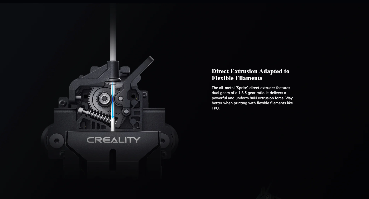این پرینتر سه بعدی مجهز به اکسترودر مستقیم تمام فلزی "Sprite" با چرخ دندههای دوگانه به نسبت 1:3.5 است. این اکسترودر قدرتمند، نیروی اکستروژن 80N را به طور یکنواخت ارائه میدهد که برای چاپ با فیلامنتهای انعطافپذیر مانند TPU ایدهآل است. استفاده از چرخ دندههای دوگانه با نسبت 1:3.5، گشتاور را به طور قابل توجهی افزایش میدهد و به اکسترودر "Sprite" قدرت لازم برای غلبه بر مقاومت فیلامنتهای انعطافپذیر را میدهد.