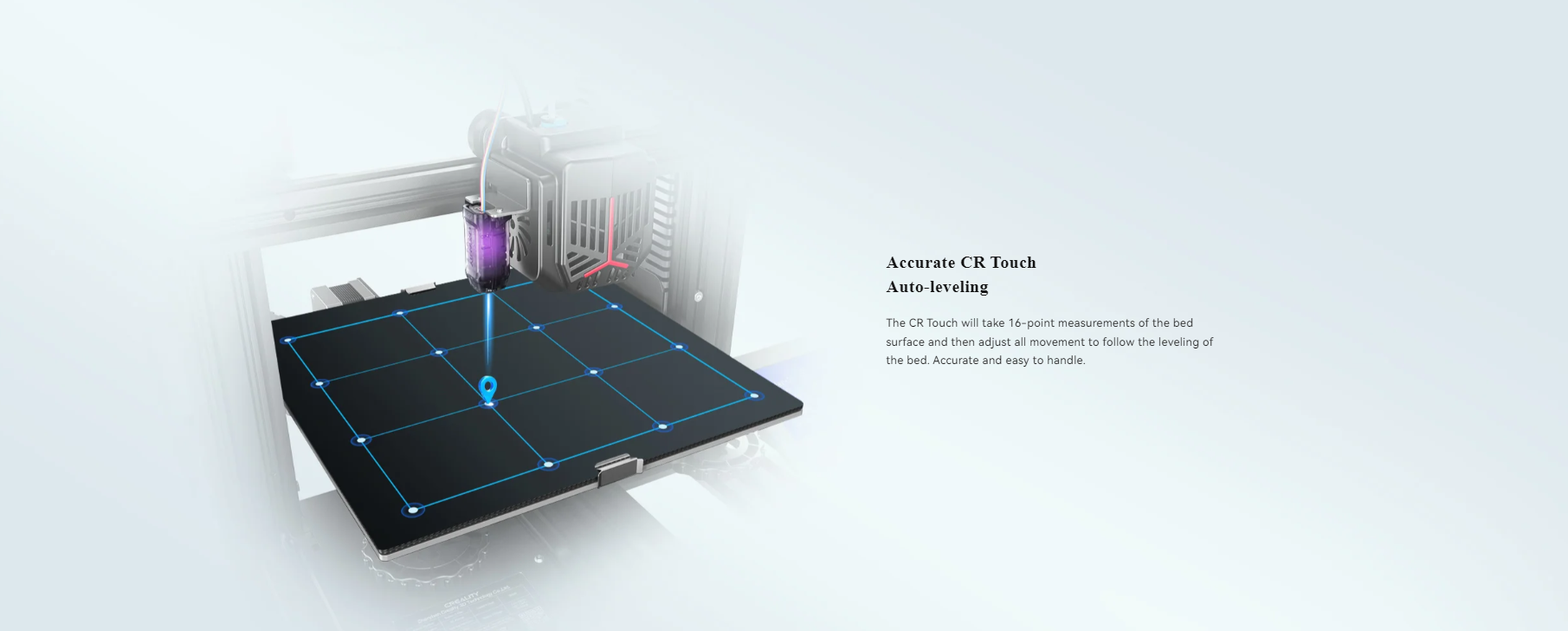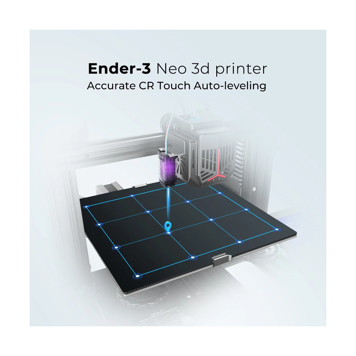 پرینتر سه بعدی CREALITY مدل ENDER-3 NEO برای تراز کردن پلتفرم ساخت از CR 16 نقطهای استفاده میکند. CR Touch به سنسور تنظیم خودکار سطح چاپ اشاره دارد. این سنسور با اندازهگیری دقیق فاصله بین نازل و سطح چاپ در نقاط مختلف، به طور خودکار ناهمواریها و شیب سطح را جبران میکند و به این ترتیب چاپ باکیفیت و یکنواخت را در سراسر بستر تضمین میکند.