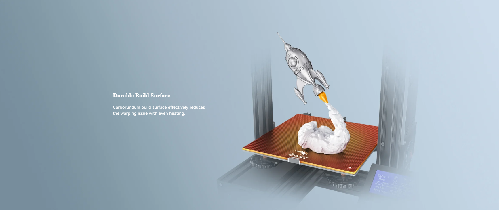 جنس صفحه ساخت در این پرینتر از جنس سیلیسیم کاربید (Carborundum) است. Carborundum چسبندگی فوقالعادهای به طیف گستردهای از فیلامنتها، بهخصوص فیلامنتهای ABS و PETG ارائه میدهد. این امر از جدا شدن لایه اول چاپ جلوگیری میکند و به شما کمک میکند تا چاپهای باکیفیت و مقاومی تولید کنید. همچنین Carborundum یک ماده بسیار سخت و بادوام است که در برابر خش و سایش مقاومت بالایی دارد.