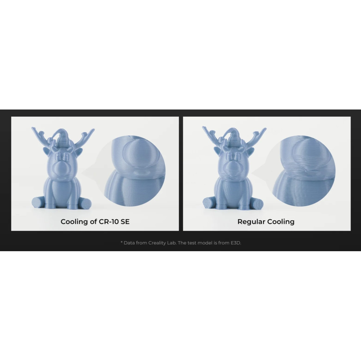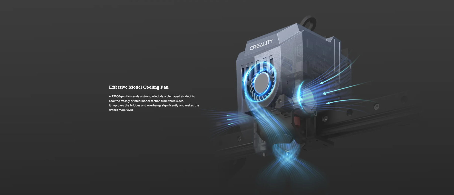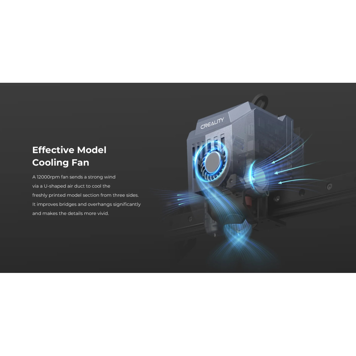 فن خنککننده مدل CR-10 SE با سرعت 12000 دور در دقیقه، جریان هوای قدرتمندی را ازطریق مجرای هوای U شکل به سمت مدل تازه چاپ شده هدایت کرده و آن را از سه طرف خنک میکند. این فرایند بهطور قابل توجهی کیفیت چاپ را با بهبود چشمگیر برجستگیها و افزایش وضوح جزئیات، ارتقاء میدهد.