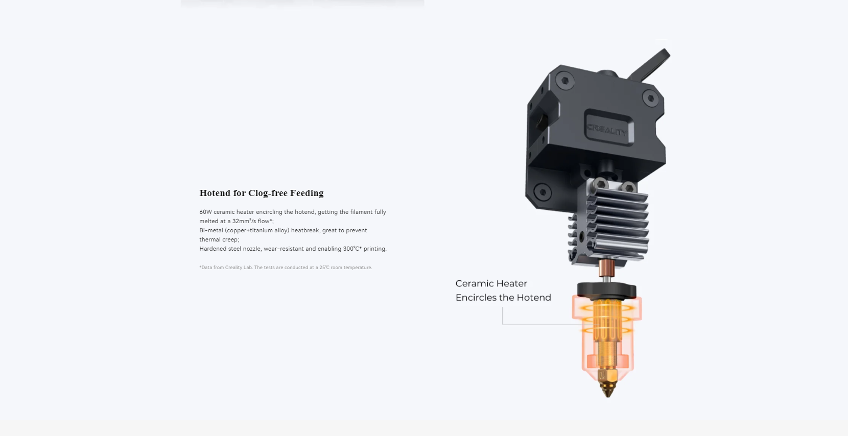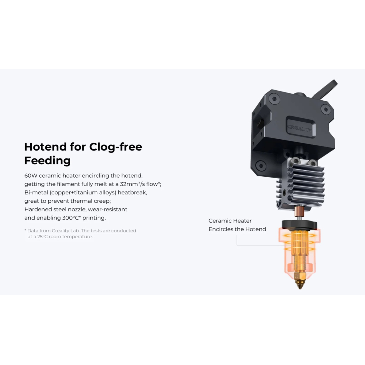 هاتاند پرینتر CR-10 SE با هیتر سرامیکی 60 واتی و جریان ذوب 32 میلیمتر مکعب برثانیه، امکان چاپ سریع و دقیق را فراهم میکند. قطعه حرارتی ساخته شده از آلیاژ مس و تیتانیوم، انتقال حرارت را بهخوبی کنترل کرده و از آسیب به قطعات دیگر جلوگیری میکند. نازل مسی مقاوم تا دمای 300 درجه سانتیگراد، قابلیت چاپ فیلامنتهای ویژه و مقاوم به حرارت را به پرینتر میبخشد.
