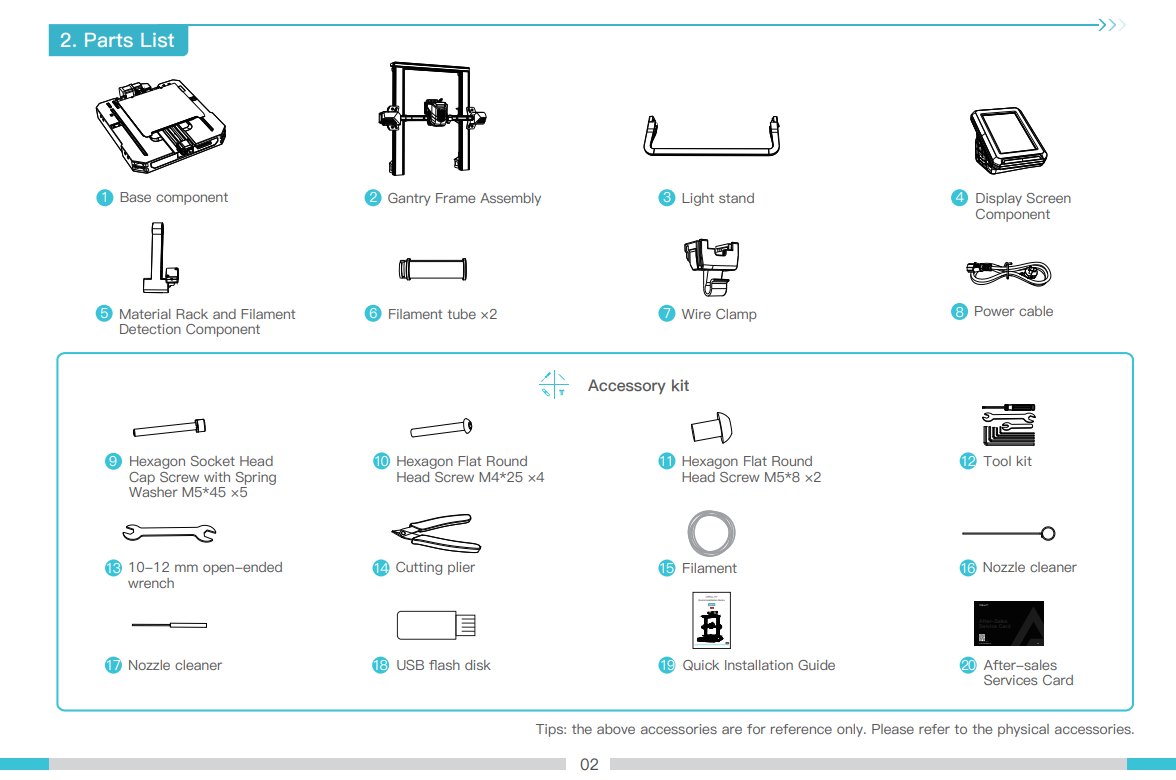 پایه، قاب، صفحه نمایش، محفظه مواد و ماژولهای تشخیص فیلامنت، لوله فیلامنت، آداپتور برق، گیره نگهدارنده کابل،
