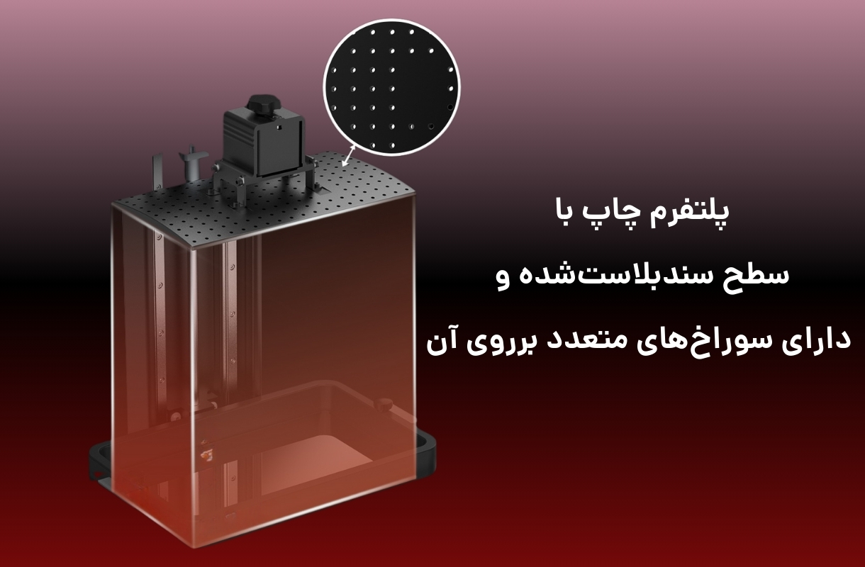 پلتفرم چاپ در پرینتر سهبعدی D136 به شکلی نوآورانه طراحی شده است تا فرایند چاپ را با سرعت و دقت بیشتری همراه کند. وجود سوراخهای متعدد روی این پلتفرم به حرکت بهتر رزین در طول چاپ کمک میکند که نتیجه آن، افزایش سرعت عملیات چاپ است. علاوهبراین، سطح این پلتفرم با یک فرایند سندبلاست ویژه زبر شده است که باعث میشود مدلها به خوبی به آن بچسبند و احتمال افتادن یا جابهجایی آنها به حداقل برسد.