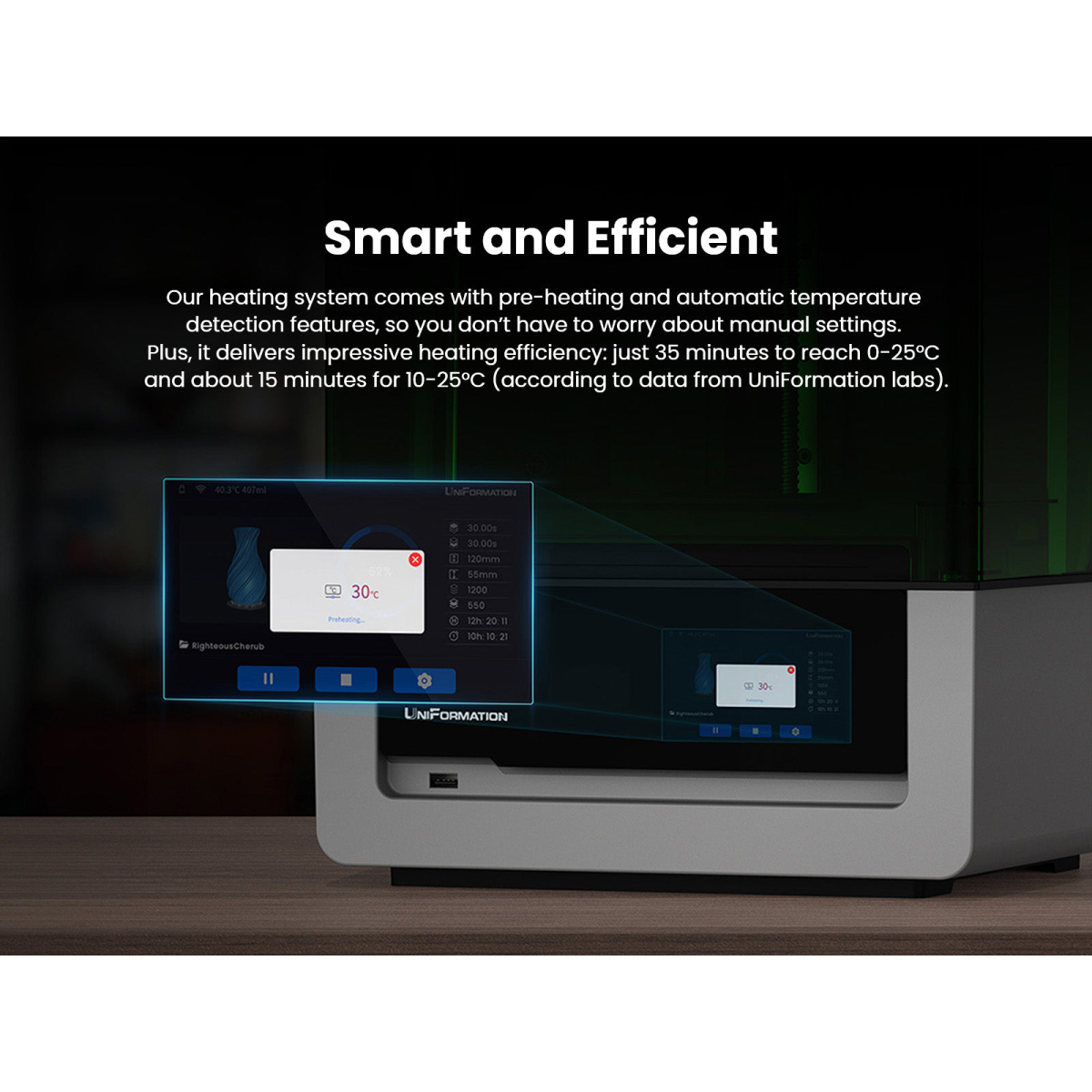 سیستم گرمایش هوشمند در Uniformation GK3 به عنوان یکی از پیشرفتهترین فناوریهای موجود در پرینترهای سهبعدی، به منظور بهبود فرآیند آمادهسازی رزین و چاپی بینقص طراحی شده است. این سیستم شامل پیشگرمایش خودکار و تشخیص هوشمند دما بوده که عملکردی یکنواخت و مؤثر را فراهم میکند.