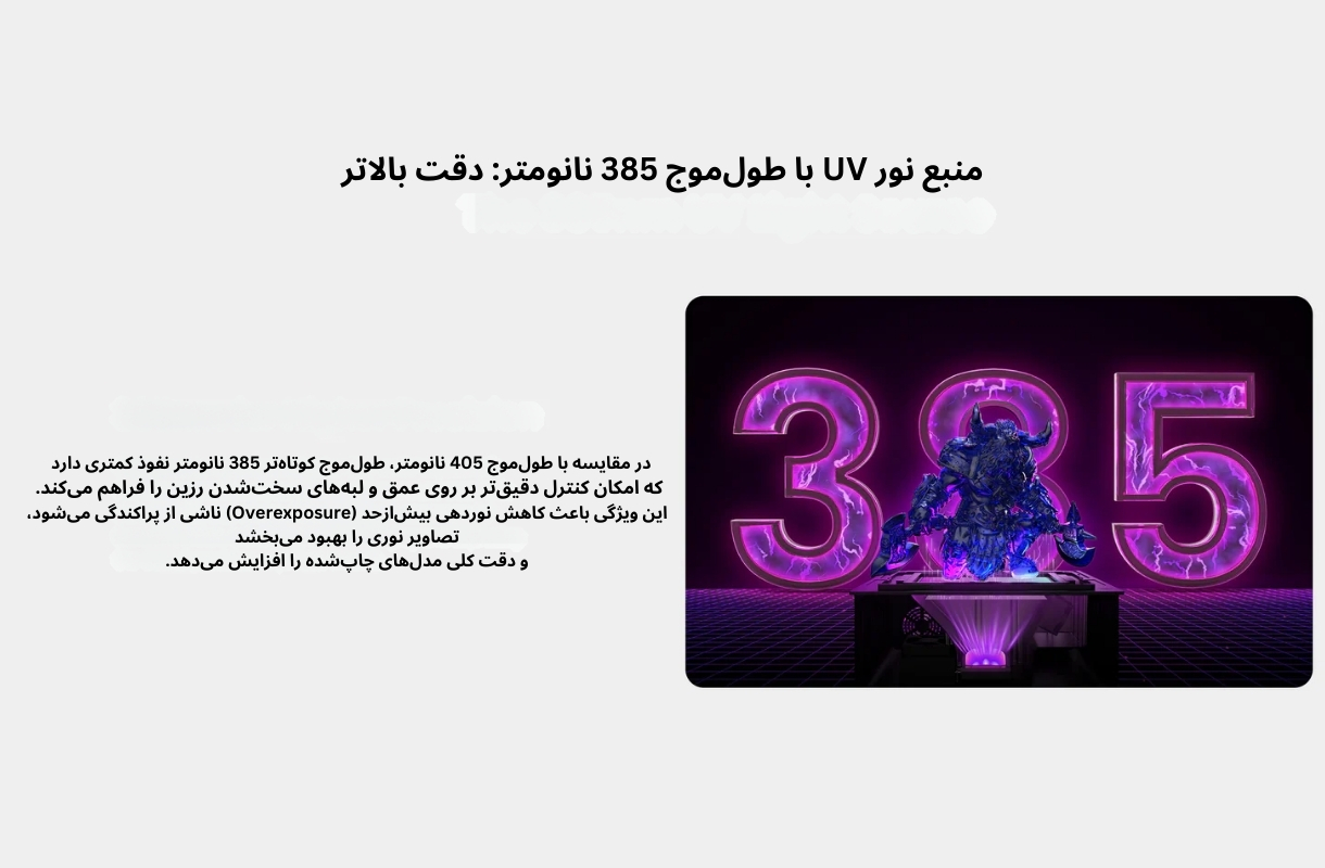 - کاهش پراکندگی نور: نور UV با طولموج 385 نانومتر به دلیل خصوصیات فیزیکی خود، پراکندگی کمتری دارد. این امر باعث میشود که نور تنها به مناطقی که نیاز به سخت شدن دارند برخورد کند، و دیگر بخشهای مدل از تأثیرات اضافی نور مصون بمانند.