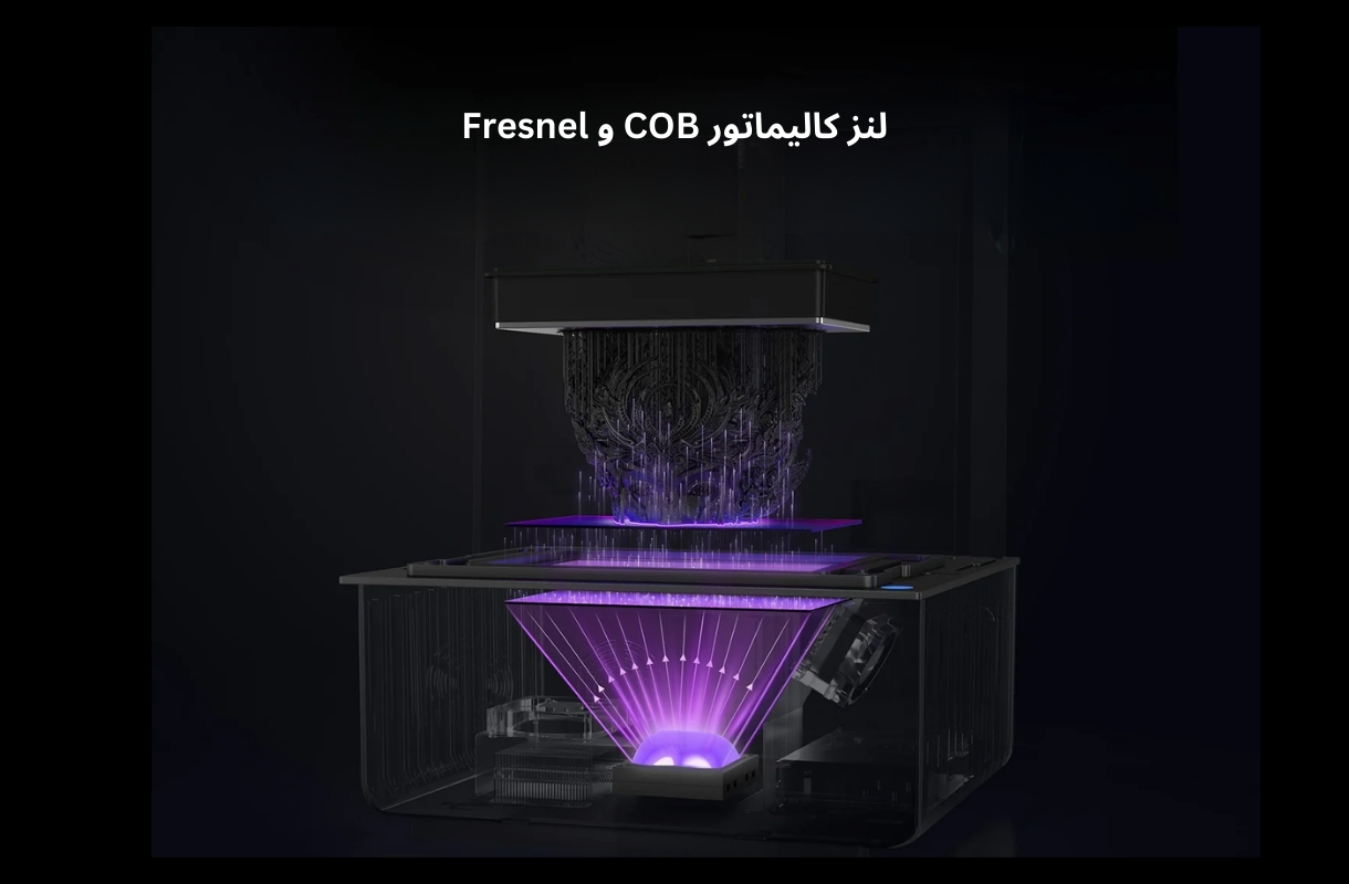 - کاهش مشکلات چاپ: در فناوریهای معمول، مشکلاتی مانند عدم یکنواختی در سخت شدن رزین یا اعوجاج لبههای مدل دیده میشود. با لنز کالیماتور COB و Fresnel، این مشکلات به حداقل میرسند، زیرا نور با دقت بالا و یکنواخت به تمامی نقاط سطح چاپ میتابد.