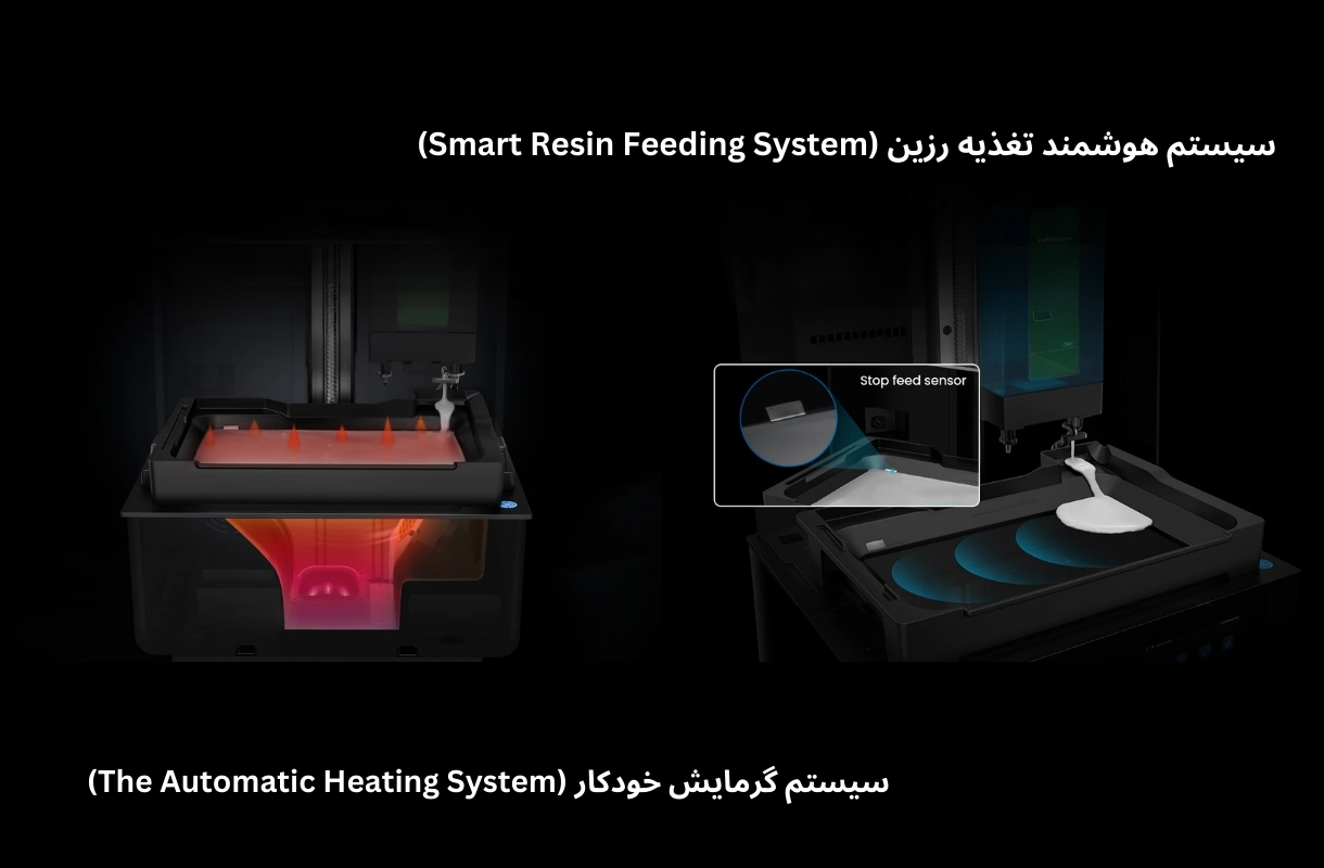 سیستم تغذیه هوشمند رزین و سیستم گرمایش خودکار با همکاری یکدیگر تجربه چاپ سهبعدی را بهینه میکنند. سیستم تغذیه، چاپ بدون وقفه و مدیریت بهینه رزین را فراهم میکند، در حالی که سیستم گرمایش تضمین میکند رزین در شرایط ایدهآل برای سخت شدن باشد. این دو فناوری به کاربران کمک میکنند تا چاپهایی با کیفیت بالا و بدون هیچگونه خطا داشته باشند.