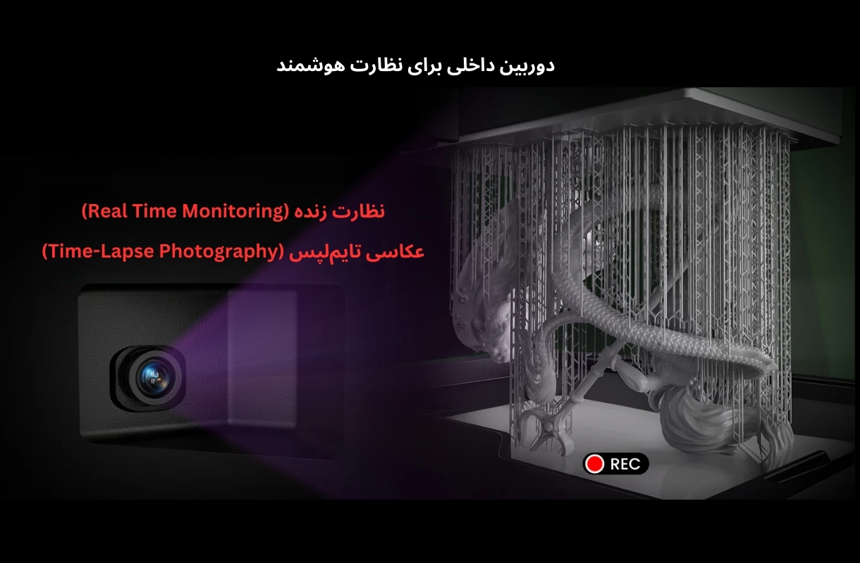 - نظارت زنده (Real-Time Monitoring): دوربین داخلی به کاربران اجازه میدهد که پیشرفت چاپ را در هر لحظه مشاهده کنند. این ویژگی مخصوصاً برای پروژههای طولانیمدت یا حساس بسیار مفید است، زیرا کاربران میتوانند در صورت بروز هرگونه مشکل، به سرعت مداخله کنند.