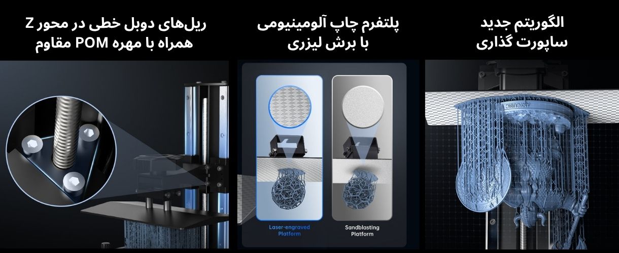 پلتفرم چاپ آلومینیومی با برش لیزری، چسبندگی بهتر مدلها و کاهش خطای چاپ را فراهم میکند. وجود ریلهای دوبل خطی در محور Z همراه با مهره POM مقاوم، حرکت روان و دقیق را تضمین میکند. همچنین الگوریتم جدید پشتیبانی، با بهبود ثبات مدل و حذف آسان ساپورتها، روند چاپ را سریعتر و تمیزتر کرده است.
