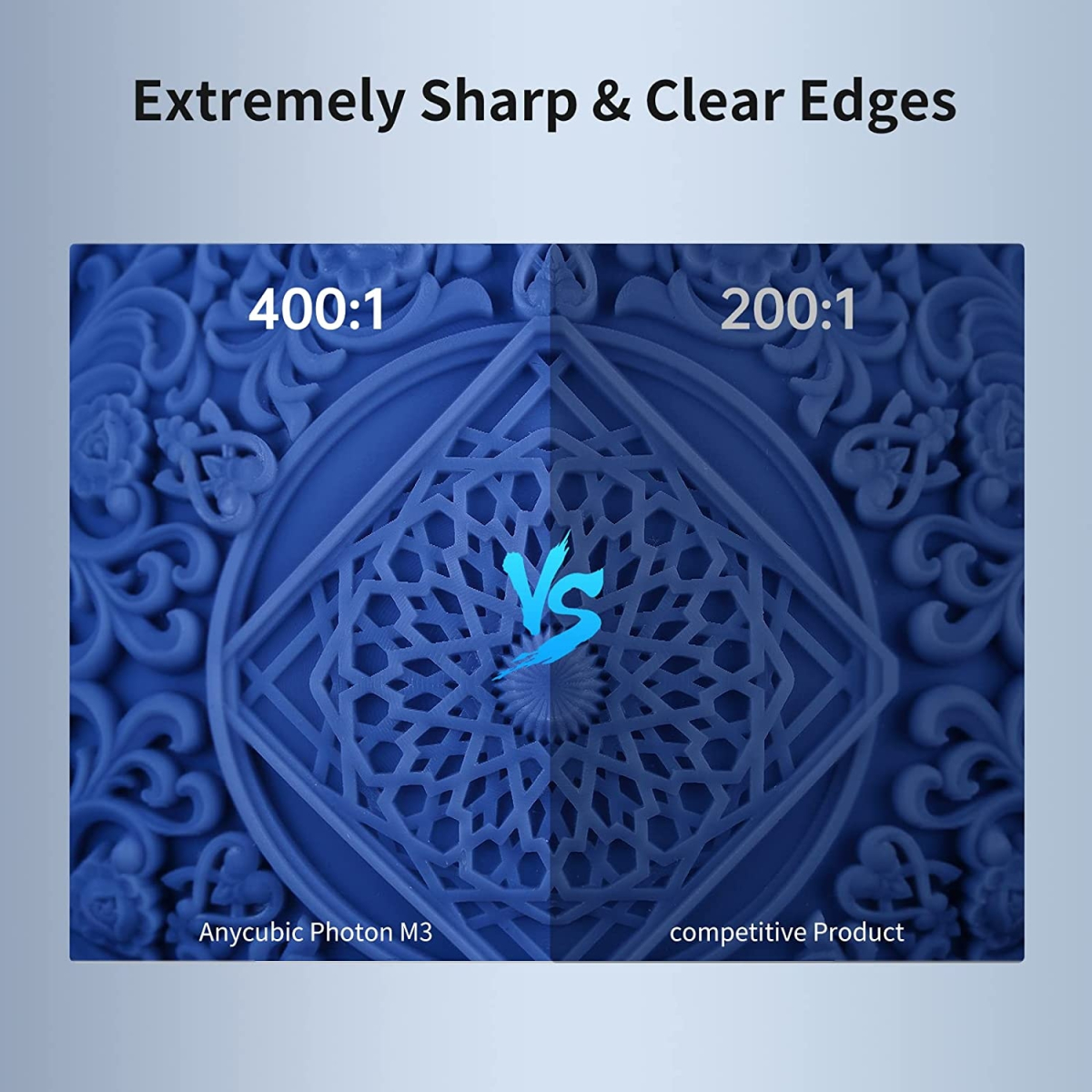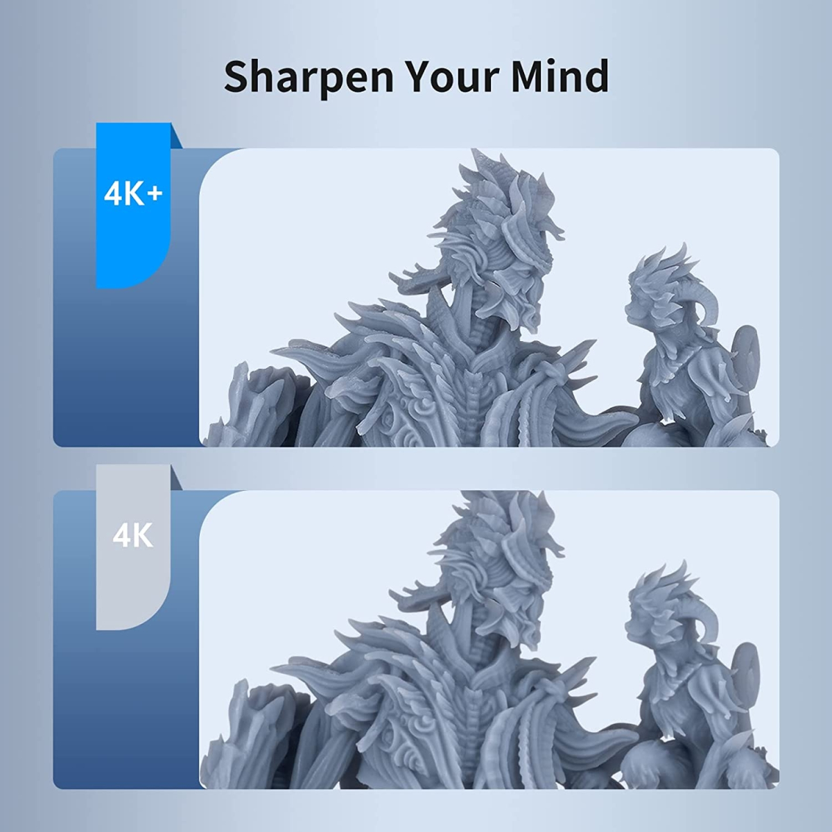 به دلیل داشتن یک السیدی UV بسیار باکیفیت با قابلیت چاپ با رزولوشن 4K پلاس یا بهعبارتی4098 در 2560 پیکسل (که از نمونه های 4K دیگر بهتر است) این پرینتر سهبعدی میتواند پرینتهایی با مقیاس بالای 400 به 1 داشته باشد و یک پرینتر سهبعدی بسیار با کیفیت و مناسب برای چاپ الگوهای سهبعدی پیچیده و مشکل میباشد. گوشهها و نقاط را بهراحتی طراحی کرده و میتواند الگوهای دارای گوشههای تیز و طراحیهای سنگین را بهراحتی انجام دهد.