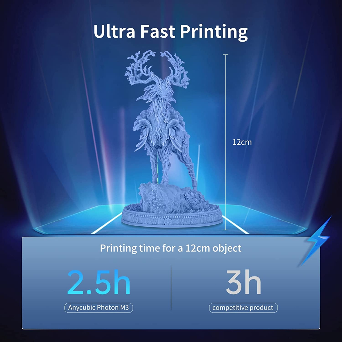 سریعترین پرینتر سهبعدی موجود میتواند در هر ساعت حدود 50 میلیمتر چاپ کند. درواقع باید گفت یکی از سریعترین پرینتر سهبعدی موجود در حال حاضر پرینتر سهبعدی Photon M3 است. بنابراین میتواند یک مدل 12 سانتیمتری را در مدتزمان 2.5 ساعت بهراحتی چاپ کند. همچنین بهجای یک منبع نوری بزرگ چندین ماتریس نوری متعدد در پرینتر سهبعدی Photon M3 تعبیه شدهاست که سبب میشود مدتزمان پرینت سهبعدی بهشدت کاهشیابد.