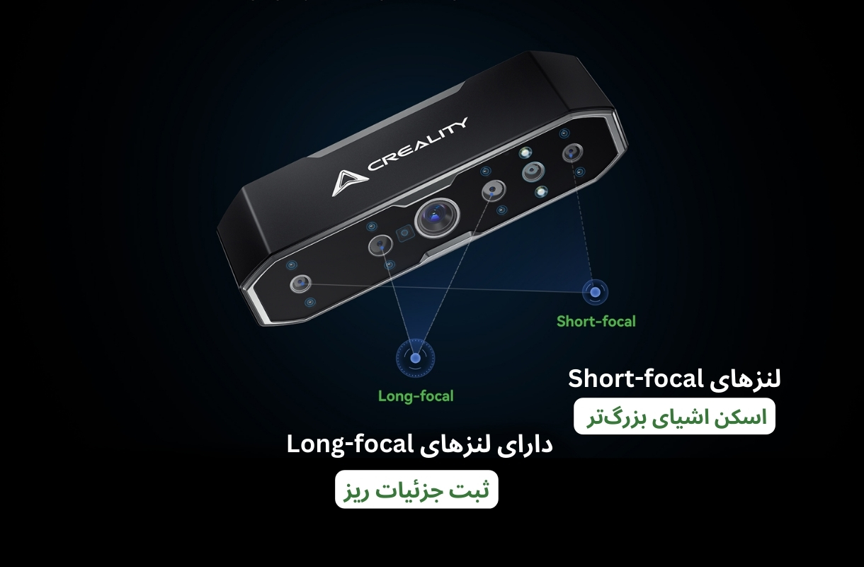 اسکنر CR- Scan Otter با بهرهگیری از سیستم استریو چهار لنزی، امکان اسکن دقیق طیف وسیعی از ابعاد را فراهم میکند. طراحی آن شامل دو مجموعه لنز دوگانه است که برای ثبت جزئیات در اندازههای مختلف بهینه شدهاند. در این ساختار، لنزهای Long-focal وظیفهی ثبت جزئیات ریز را بر عهده دارند. این لنزها مخصوص اسکن اشیای کوچک هستند و قادرند با دقت بالاتری، بافت و ویژگیهای ظریف را ثبت کنند. از سوی دیگر، لنزهای Short-focal برای اسکن اشیای بزرگتر طراحی شدهاند و امکان پوششدهی طیف وسیعتری از اندازهها را فراهم میکنند. این ترکیب باعث میشود که اسکنر در ثبت جزئیات ریز و همچنین پوشش گستردهتر برای اشیای بزرگ، عملکردی متعادل و کاربردی داشته باشد.
