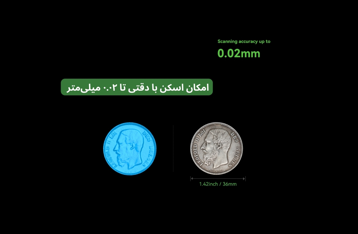 این فناوری، امکان اسکن با دقتی تا ۰.۰۲ میلیمتر را فراهم کرده است که تضمین میکند حتی ریزترین جزئیات نیز با وضوح بالا و بدون از دست رفتن کیفیت ثبت شوند. نمونهی نمایش دادهشده در تصویر، سکهای با قطر ۳۶ میلیمتر (۱.۴۲ اینچ) است که تمامی خطوط برجسته و بافتهای آن با دقت بالا در مدل سهبعدی بازسازی شدهاند.