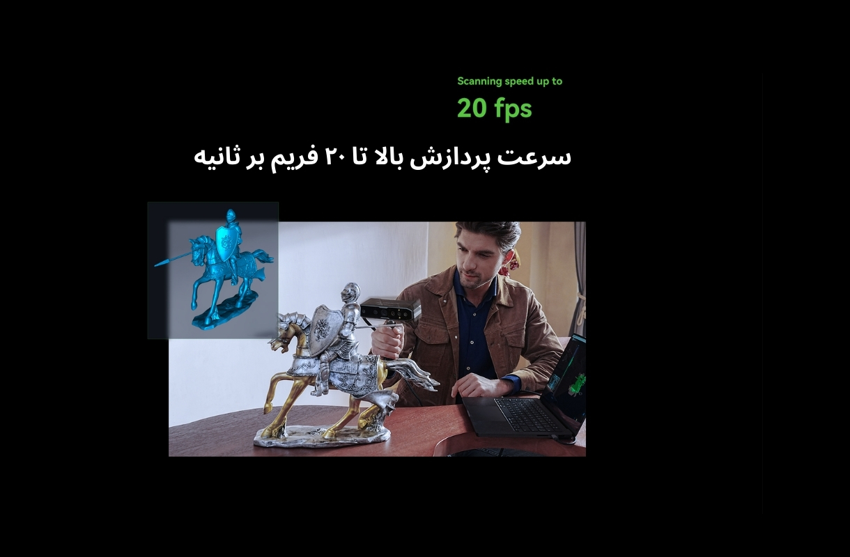 یکی از نکات برجستهی این دستگاه، سرعت پردازش بالا تا ۲۰ فریم بر ثانیه است که به کاربر اجازه میدهد تا با سرعت بیشتر و دقت بالاتر مدلهای سهبعدی را اسکن کند. این قابلیت، تأخیر در اسکن را کاهش داده و تجربهای سریع، روان و بدون وقفه را ارائه میدهد.