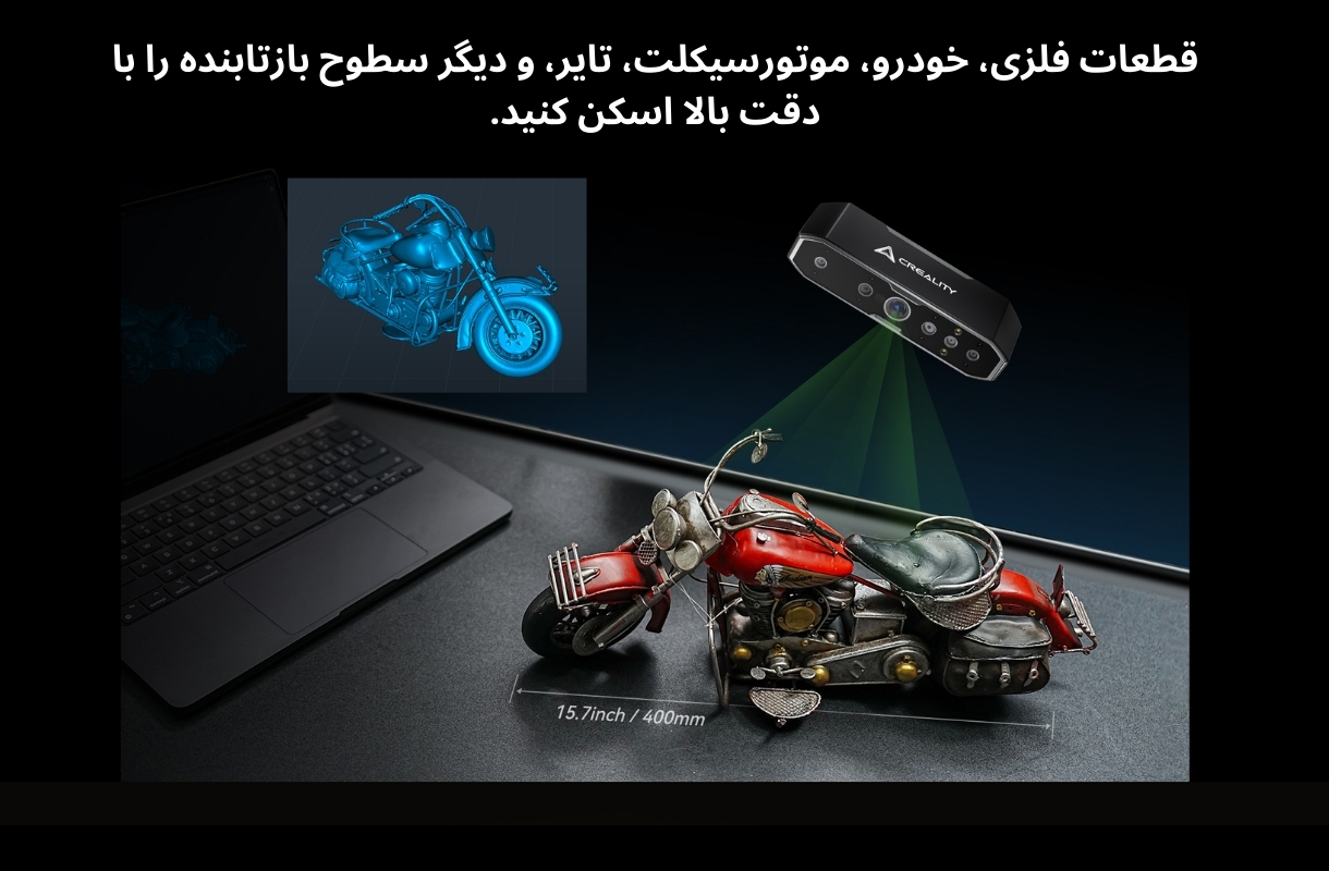 این اسکنر با فناوری پردازش نوری پیشرفته و حسگرهای بهینهشده، امکان اسکن مستقیم اجسام سیاه و فلزی را بدون نیاز به هیچگونه اسپری فراهم کرده است. در نتیجه، شما میتوانید اشیایی مانند قطعات فلزی، خودرو، موتورسیکلت، تایر، و دیگر سطوح بازتابنده را با دقت بالا اسکن کنید. هماهنگونه که در تصویر، مشاهده میکنید این اسکنر یک موتورسیکلت فلزی و بازتابنده با ابعاد ۴۰۰ میلیمتر را بدون نیاز به اسپری و با دقت بالا اسکن کرده است. تمامی جزئیات، از بدنهی براق گرفته تا قطعات کوچک مکانیکی، در مدل سهبعدی بازسازی شدهاند.
