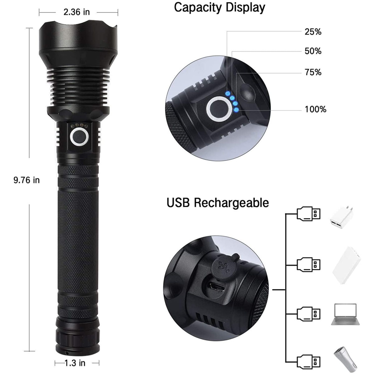 نمایشگر شارژی و برقی : چراغ قوه شارژی USB توسط باتریهای لیتیومی قابل شارژ 2*26650 تغذیه میشود، طولانیترین زمان کار تا 9 ساعت است. علاوه بر این، چراغ قوه LED ما عملکرد نمایش قدرت را دارد، بنابراین میتوانید با یک نگاه، بدون حدس زدن میزان قدرت باقیمانده را تعیین کنید. باید شارژ شود. روش های شارژ متنوع: دوشاخه، پاوربانک، لپ تاپ، شارژر ماشین