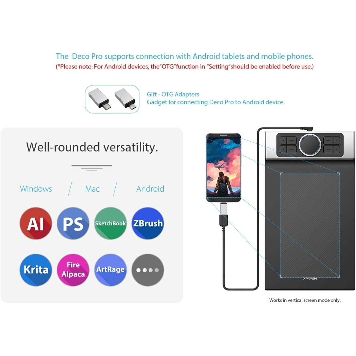 تبلت گرافیکی Deco Pro M دارای آداپتور OTG است که به کاربران این امکان را میدهد که آن را به دستگاههای اندرویدی متصل کنند. ویژگی OTG (On-The-Go) باعث میشود تا بدون نیاز به رایانه شخصی یا لپتاپ، تبلت طراحی خود را مستقیماً به گوشیهای هوشمند یا تبلتهای اندرویدی متصل کنید. این قابلیت آزادی بیشتری را به هنرمندان دیجیتال میدهد تا در هر مکانی و بدون محدودیتهای معمول، طراحیهای خود را انجام دهند. اتصال از طریق OTG بسیار ساده است؛ تنها با استفاده از یک کابل و آداپتور میتوانید دستگاه را به گوشی یا تبلت خود متصل کنید و بلافاصله کار طراحی را آغاز کنید.