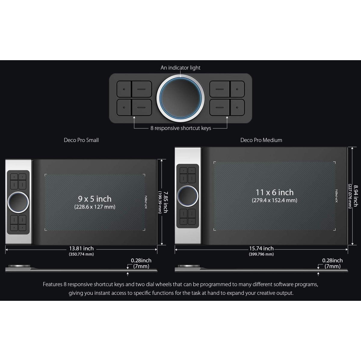تبلت گرافیکی Deco Pro M دارای هشت کلید میانبر قابل تنظیم است که به کاربران امکان این را میدهد فرایند طراحی خود را سریعتر و کارآمدتر انجام دهند. این کلیدها به طور کامل قابل شخصیسازی هستند؛ به این معنا که شما میتوانید هر یک از آنها را بر اساس نیازهای خود تنظیم کنید. این ویژگی باعث میشود تا در حین کار، نیازی به استفاده مکرر از صفحهکلید یا حرکت بین منوهای مختلف نباشد و بتوانید بهصورت مستقیم از روی تبلت به ابزارها دسترسی داشته باشید. این قابلیت علاوهبر افزایش سرعت کار، کنترل بیشتری را نیز در فرایند طراحی فراهم میکند و نتیجه نهایی بهتری را برای شما به همراه خواهد داشت.