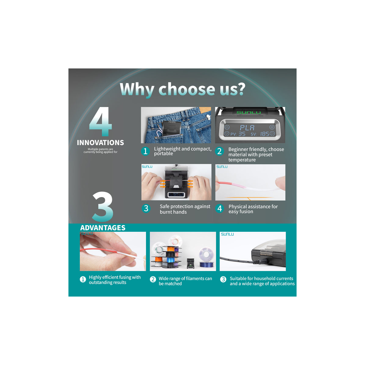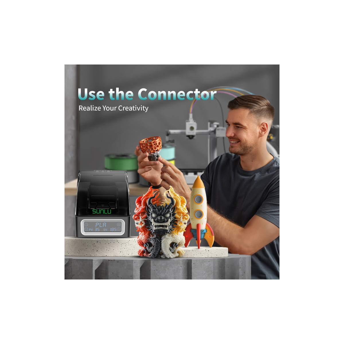 با استفاده از دستگاه فیلامنت کانکتور Sunlu، میتوانید بهراحتی فیلامنتهای یکسان از نظر نوع مواد ولی با رنگهای متفاوت را به یکدیگر متصل کنید. این ویژگی باعث میشود تا مدلهای سهبعدی رنگارنگ، چاپهای شخصیسازیشده و حتی افکتهای گرادیان زیبا را خلق کنید.