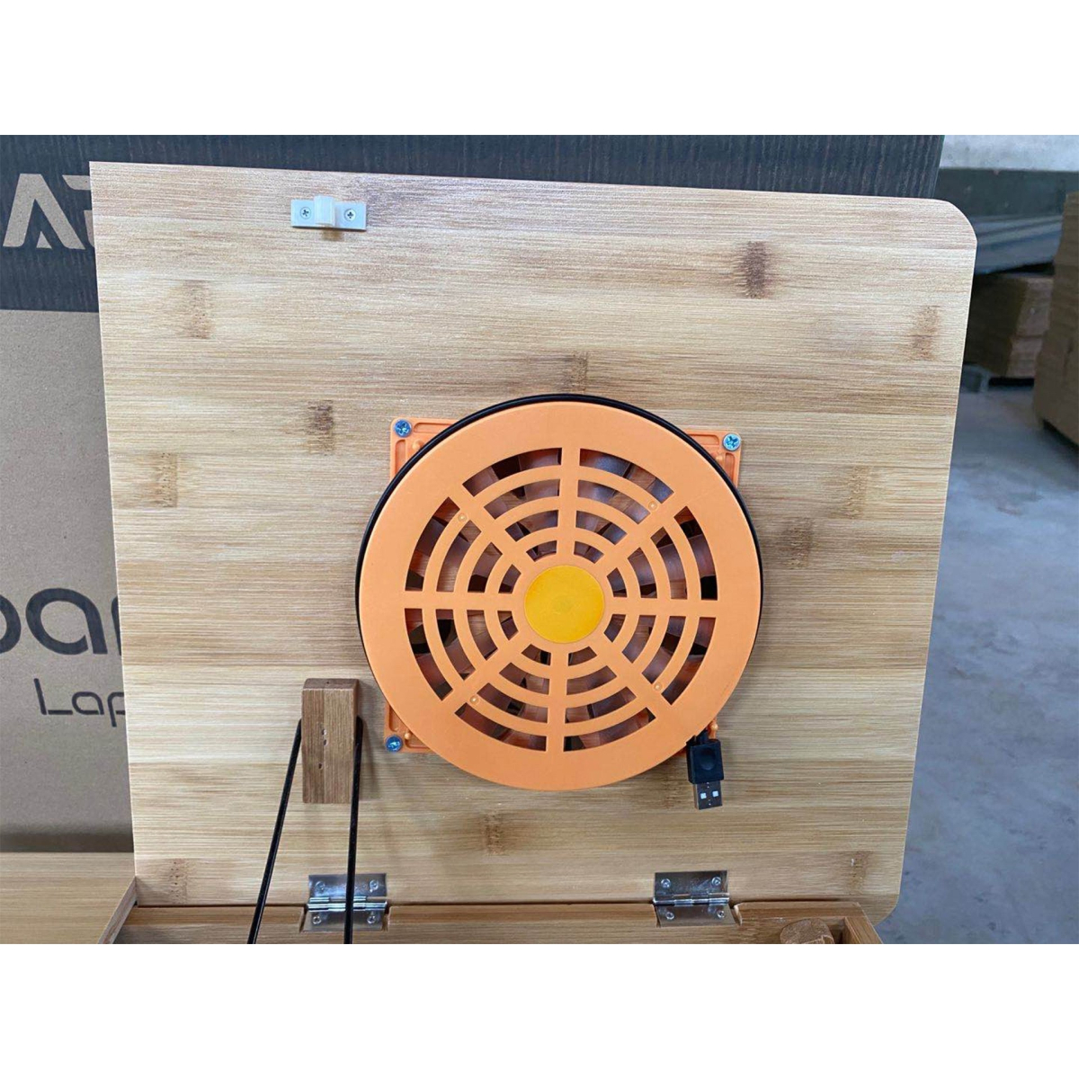 بر روی سطح زیرین این میز لپ‌تاپ، یک فن بزرگ یا دو فن متوسط، بسته به نوع میز لپ‌تاپی که انتخاب می‌کنید، وجود دارد. این فن‌های خنک‌کننده سبب می‌شوند که لپ‌تاپ شما دمای بالایی را نداشته باشد و از این بابت دچار اضطراب نشوید. خصوصاً اگر کارهای سنگین همچون گیمینگ، کارهای مهندسی، برنامه‌نویسی، طراحی‌های گرافیکی پیشرفته، نرم‌افزارهای معماری و غیره انجام می‌دهید، این امر برای شما بسیار مهم و ضروری است که حتما برای لپ‌تاپ‌تان فن‌های خنک‌کننده متعددی در نظر بگیرید. زیرا این امر باعث افزایش طول عمر و بهبود کیفیت حین استفاده لپ‌تاپ شما می‌شود. فن‌های خنک‌کننده از طریق کابل USB به لپ‌تاپ شما متصل می‌شوند و شروع به کار می‌کنند. همچنین متوجه خواهید شد که این فن‌ها از صدای آزاردهنده‌ای برخوردار نیستند و اصلا متوجه روشن بودن آن‌ها نمی‌شوید. در بسیاری از میز لپ‌تاپ‌هایی که در بازار موجود هستند، به این نکته دقت نکردند و شما هنگام اتصال فن‌های خنک‌کننده به میز لپ‌تاپ مورد نظرتان کاملاً متوجه صدای فن‌های خنک‌کننده می‌شوید. سپس پس‌از دقایقی از صدای بسیار بالای آن‌ها آشفته می‌شوید و مجبور هستید که این فن‌ها را خاموش کرده و کابل USB را دربیاورید. اما در میز بامبو مخصوص لپ‌تاپ فروشگاه قشم خرید این‌موضوع کاملاً رعایت شده‌است.