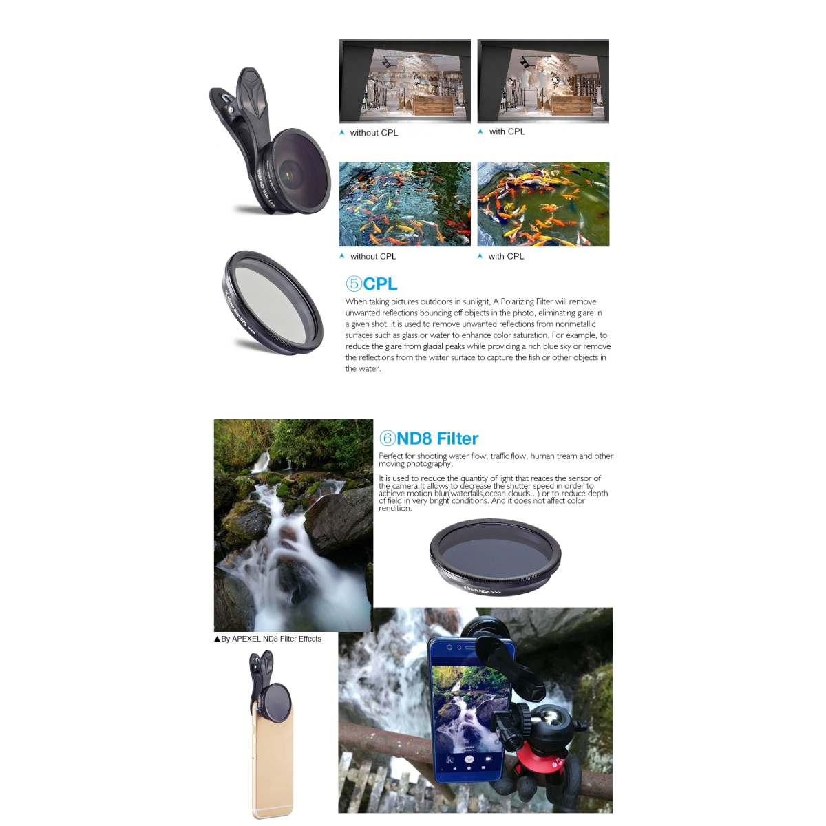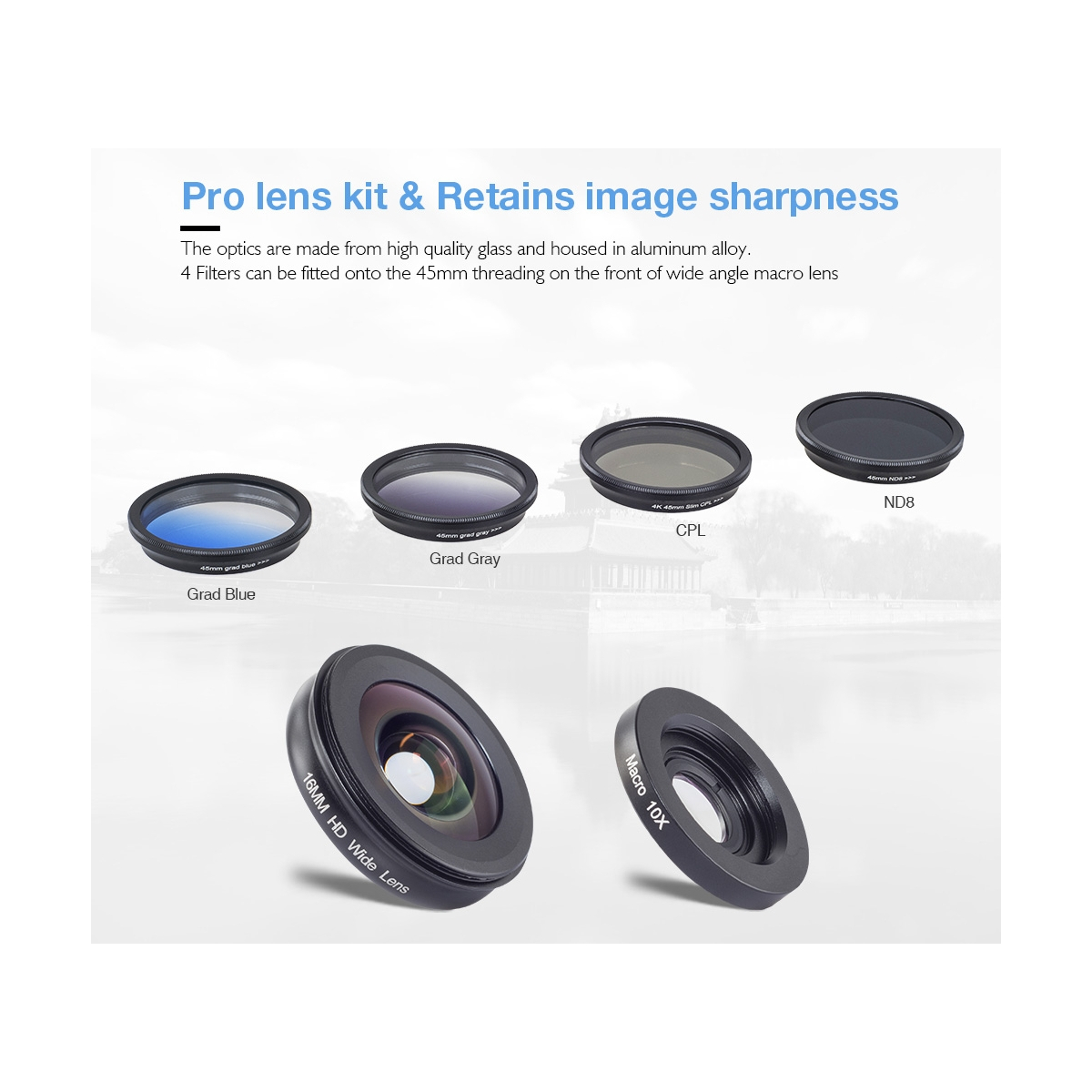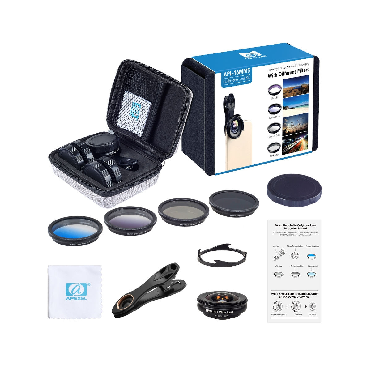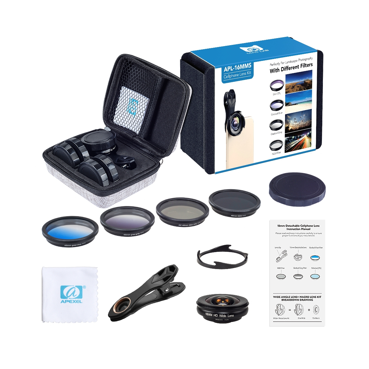 لنز apl-16mms به همراه 5 فیلتر به شما امکان میدهد مناظر بیشتری را نسبت به حالت عادی آن بگیرید، این لنز برای مناظر شهری و عکسهای گروهی بزرگ، عالی است.لنز 10x ماکرو به شما امکان می دهد تلفن خود را در فاصله 1.5 تا 5 سانتی متری از چیزی که عکاسی می کنید فوکوس کنید، چیزهای ریز را با جزئیات مانند گل ها، سکه ها و حشرات و غیره عکس برداری کنید.هنگامی که از لنز ماکرو 10x استفاده می کنید، باید آن را به چیزی که می خواهید عکاسی کنید بسیار نزدیک کنیدلنز CPL بازتاب های ناخواسته را از سطوح غیر فلزی مانند شیشه یا آب حذف می کند تا اشباع رنگ را افزایش دهد.فیلتر آبی Grad برای افزودن رنگ به قسمتی از عکس بدون تأثیر بر رنگ سایر قسمت ها استفاده می شود. به عنوان مثال، آبی را فقط به آسمان یا دریا اضافه کنید.فیلتر خاکستری Grad برای تقویت یک آسمان خاکستری و کم درخشش با دادن جنبه آفتابی به آن استفاده می شود، کاری که فیلتر پلاریزه در این شرایط نمی تواند انجام دهد. استفاده از فیلتر خاکستری مناسب باعث می شود که تصویر ظاهر طبیعی خود را حفظ کند.فیلتر ND8 برای کاهش مقدار نوری که به سنسور دوربین می رسد استفاده می شود. آنها به منظور دستیابی به تاری حرکت (آبشارها، اقیانوس ها، ابرها…) یا کاهش عمق میدان در شرایط بسیار روشن، سرعت شاتر را کاهش می دهند. از آنجایی که فیلترهای ND "خنثی" هستند، بر نمایش رنگ تأثیر نمی گذارند.