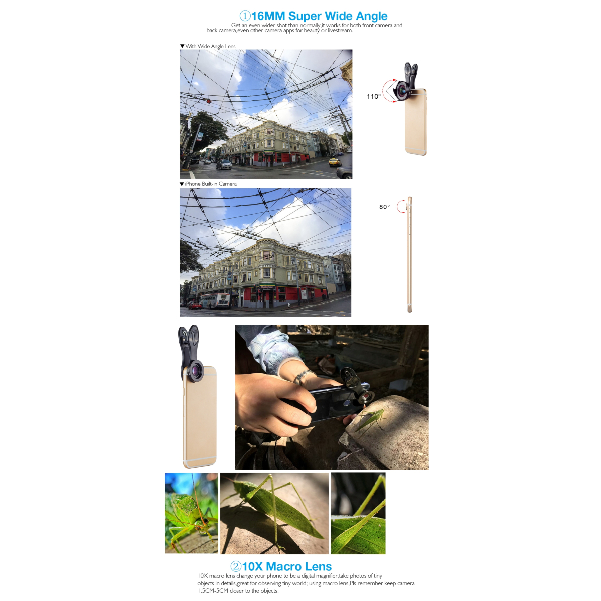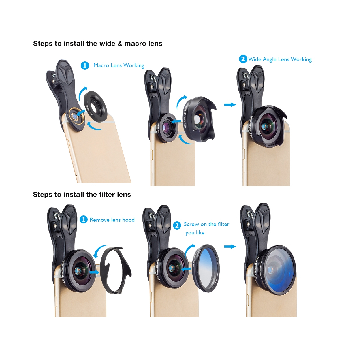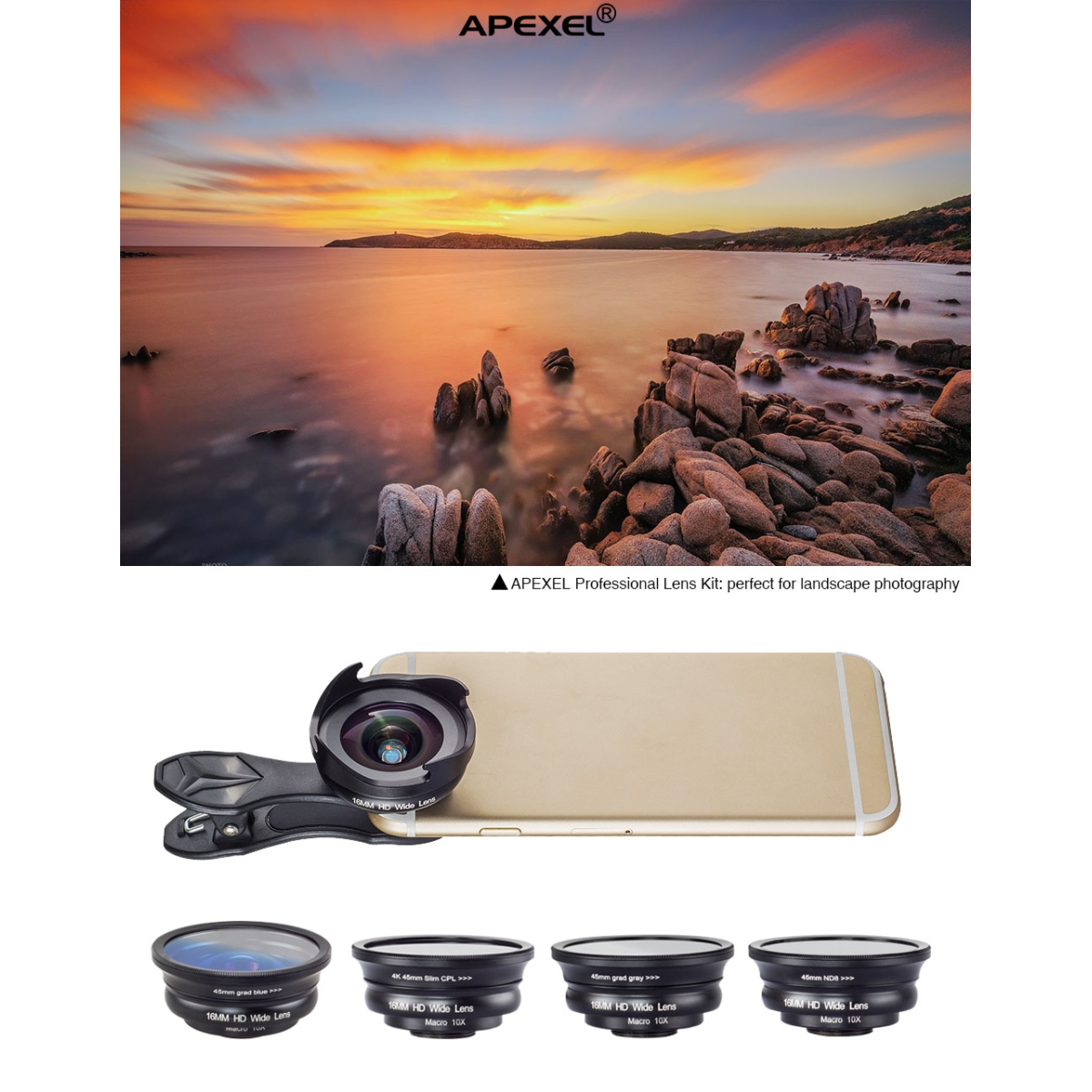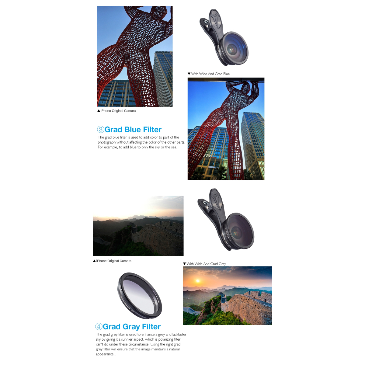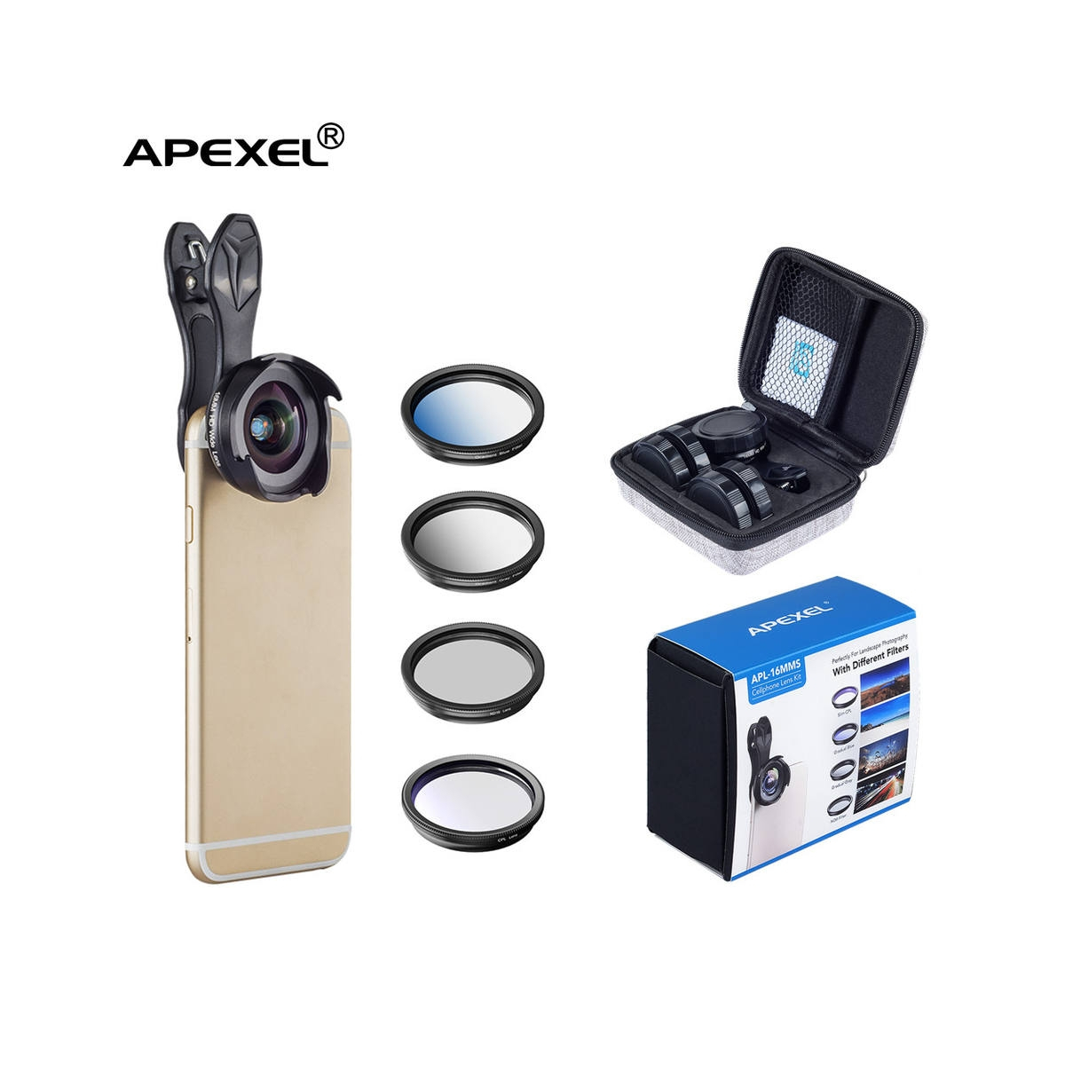 لنز apl-16mms به همراه 5 فیلتر به شما امکان میدهد مناظر بیشتری را نسبت به حالت عادی آن بگیرید، این لنز برای مناظر شهری و عکسهای گروهی بزرگ، عالی است.لنز 10x ماکرو به شما امکان می دهد تلفن خود را در فاصله 1.5 تا 5 سانتی متری از چیزی که عکاسی می کنید فوکوس کنید، چیزهای ریز را با جزئیات مانند گل ها، سکه ها و حشرات و غیره عکس برداری کنید.هنگامی که از لنز ماکرو 10x استفاده می کنید، باید آن را به چیزی که می خواهید عکاسی کنید بسیار نزدیک کنیدلنز CPL بازتاب های ناخواسته را از سطوح غیر فلزی مانند شیشه یا آب حذف می کند تا اشباع رنگ را افزایش دهد.فیلتر آبی Grad برای افزودن رنگ به قسمتی از عکس بدون تأثیر بر رنگ سایر قسمت ها استفاده می شود. به عنوان مثال، آبی را فقط به آسمان یا دریا اضافه کنید.فیلتر خاکستری Grad برای تقویت یک آسمان خاکستری و کم درخشش با دادن جنبه آفتابی به آن استفاده می شود، کاری که فیلتر پلاریزه در این شرایط نمی تواند انجام دهد. استفاده از فیلتر خاکستری مناسب باعث می شود که تصویر ظاهر طبیعی خود را حفظ کند.فیلتر ND8 برای کاهش مقدار نوری که به سنسور دوربین می رسد استفاده می شود. آنها به منظور دستیابی به تاری حرکت (آبشارها، اقیانوس ها، ابرها…) یا کاهش عمق میدان در شرایط بسیار روشن، سرعت شاتر را کاهش می دهند. از آنجایی که فیلترهای ND "خنثی" هستند، بر نمایش رنگ تأثیر نمی گذارند.