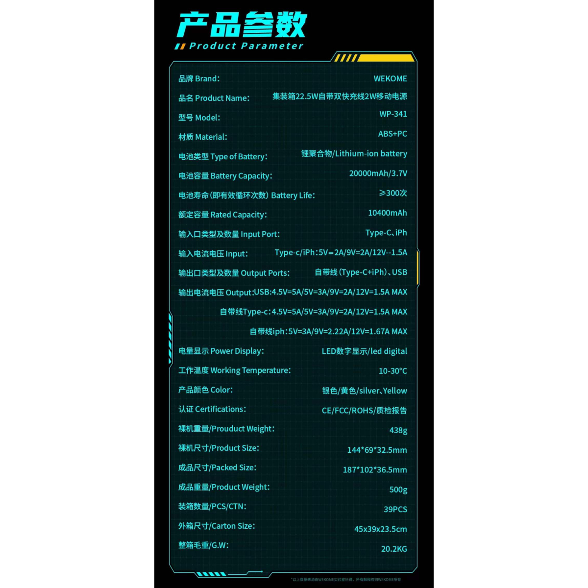پاوربانک فست شارژ ویکام 10000 میلی آمپر مدل WP-339 برند WEKOME سوپر فست شارژ 22.5 وات