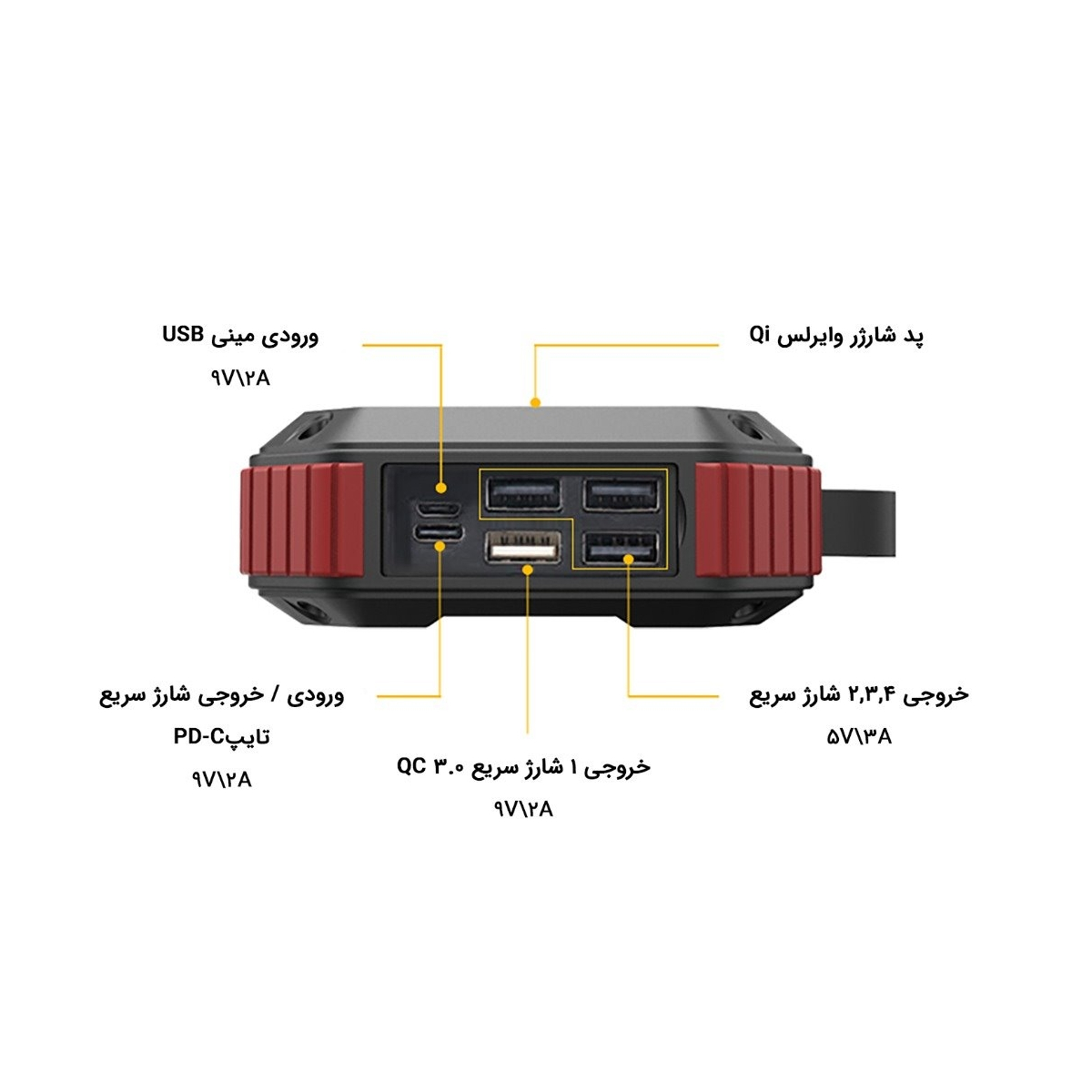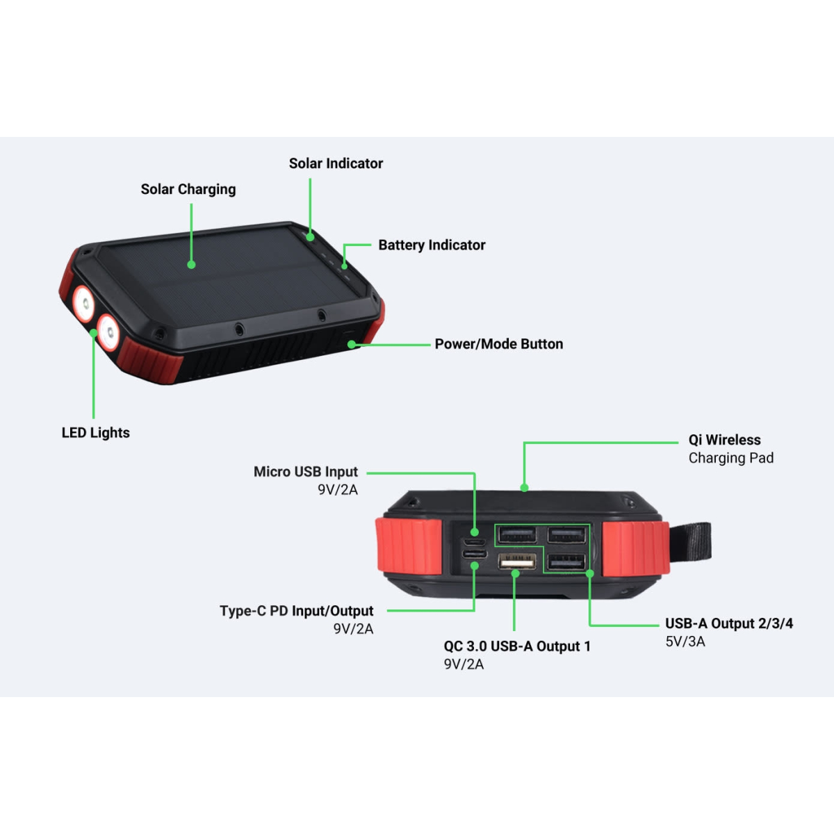 این محصول دارای 5 درگاه خروجی می‌باشد که 4 درگاه با کابل و دیگری شارژر Type-C است. درگاه اول 12 ولت و 1.5 آمپر، درگاه دوم و سوم و چهارم 5 ولت و 3 آمپر و درگاه Type-C در این دستگاه 9 ولت و 2 آمپر و شارژر وایرلس آن 10 واتی است. اگر می‌خواهید تنها به وسیله پنل خورشیدی پاوربانک را شارژ کنید حدود یک هفته طول می‌کشد تا 100درصد شارژ شود. اما در صورتی که ضرورتی نداشته باشد به وسیله کابل طی 7 الی 9 ساعت به وسیله درگاه خروجی 12 آمپری، پاوربانک را می‌توانید کامل شارژ کنید.