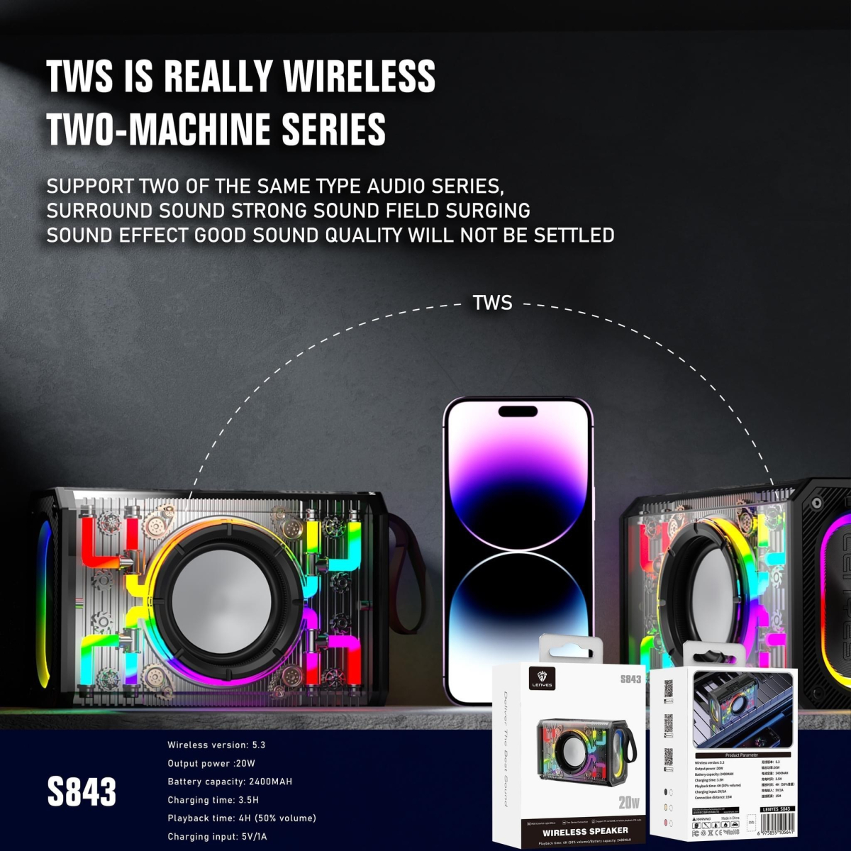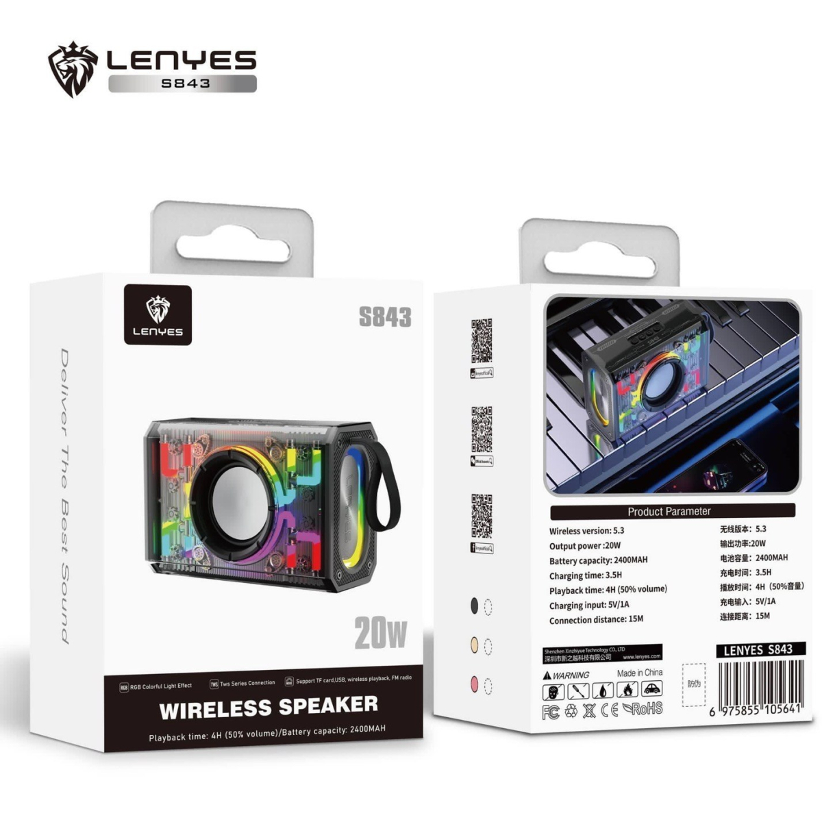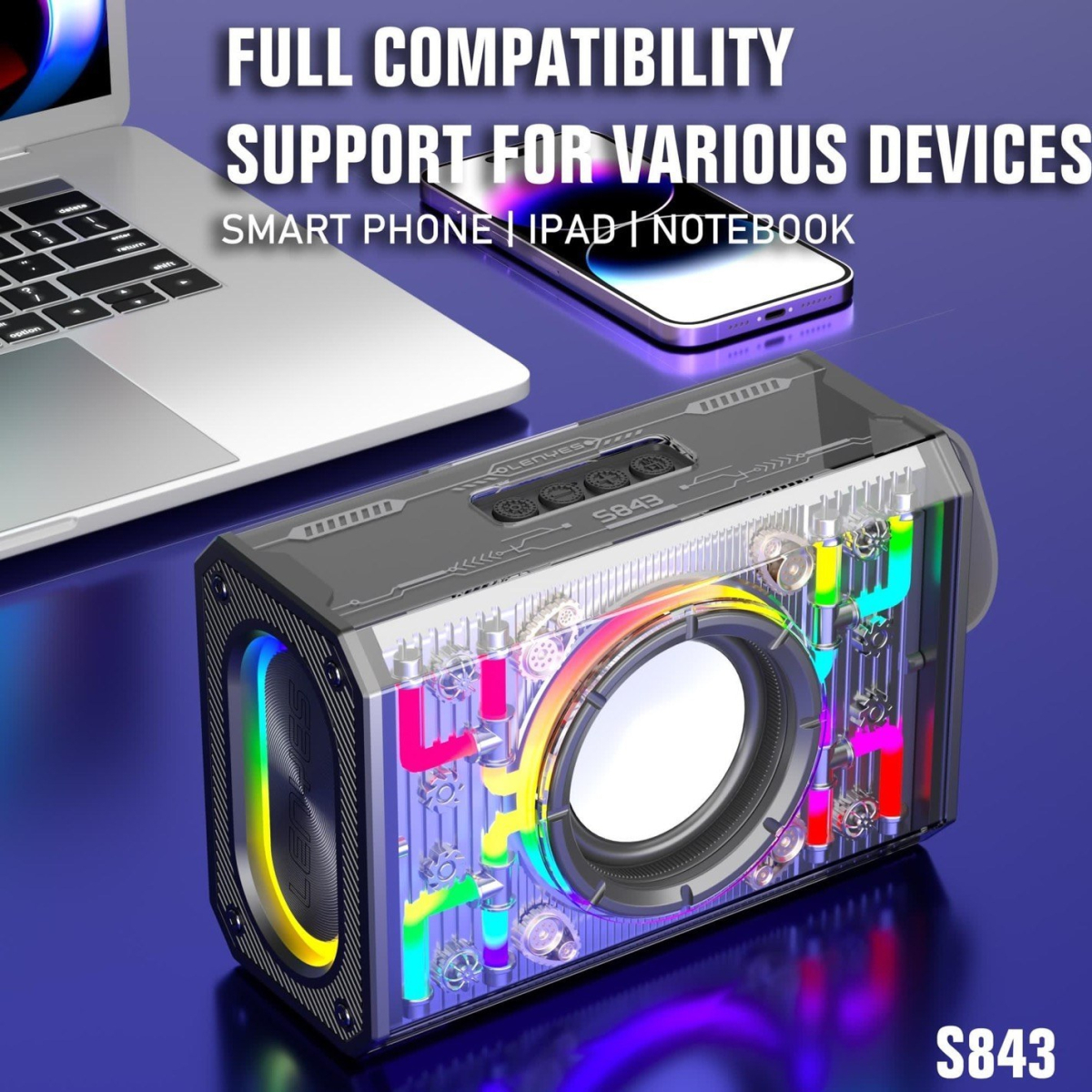 اسپیکر لنیز مدل S843 یک گزینه جذاب و همه‌کاره برای علاقه‌مندان به موسیقی و کیفیت صدای بالا است. طراحی شفاف و مدرن این محصول با نورپردازی رنگارنگ، جلوه‌ای شگفت‌انگیز به محیط شما می‌بخشد. قابلیت TWS و صدای فراگیر، تجربه‌ی گوش دادن به موسیقی را به سطح جدیدی می‌برد. باتری قدرتمند و زمان پخش مناسب، این اسپیکر را به گزینه‌ای عالی برای استفاده‌های روزمره و رویدادهای خاص تبدیل کرده است. اگر به دنبال اسپیکری با عملکرد قدرتمند و طراحی متفاوت هستید،S843 انتخابی ایده‌آل است.